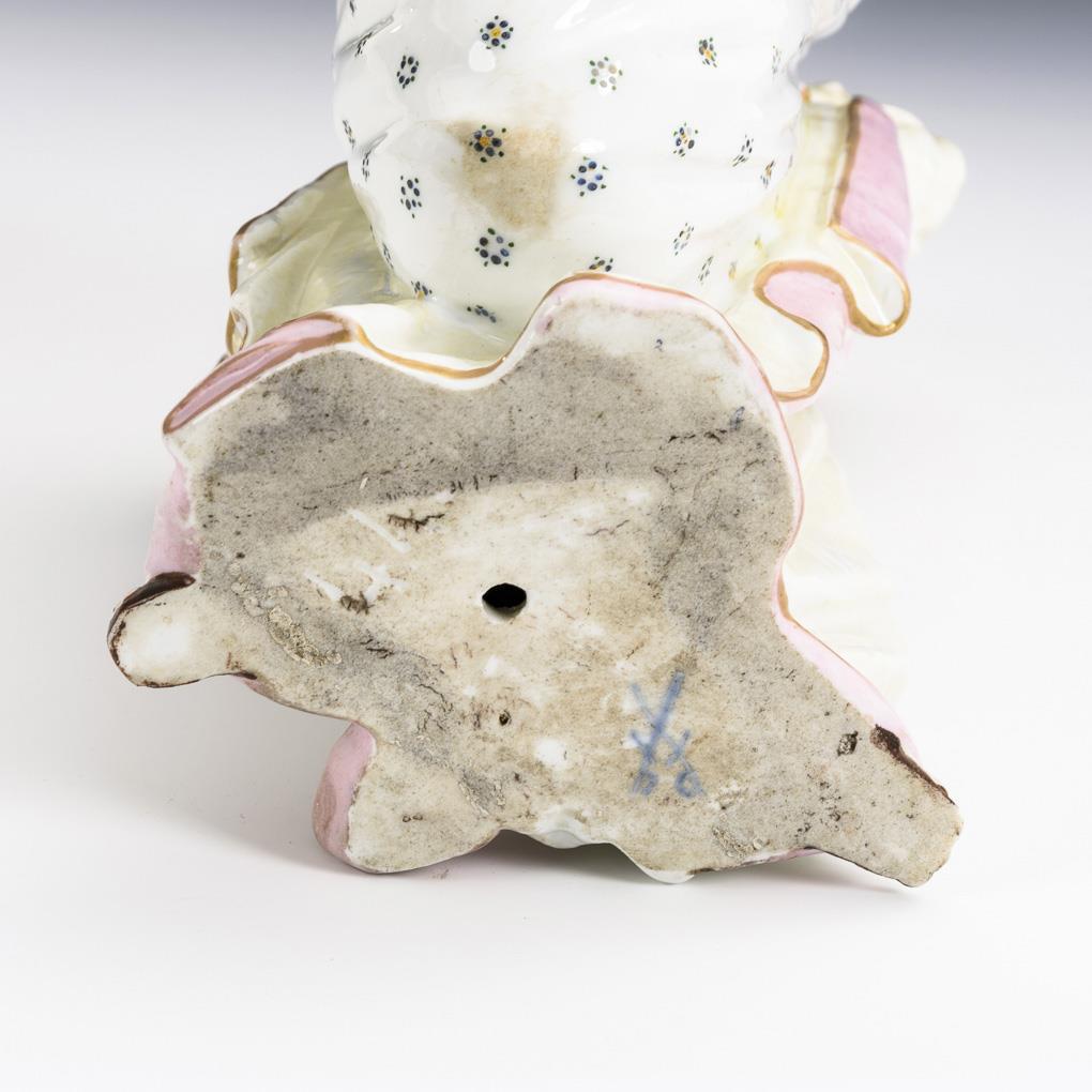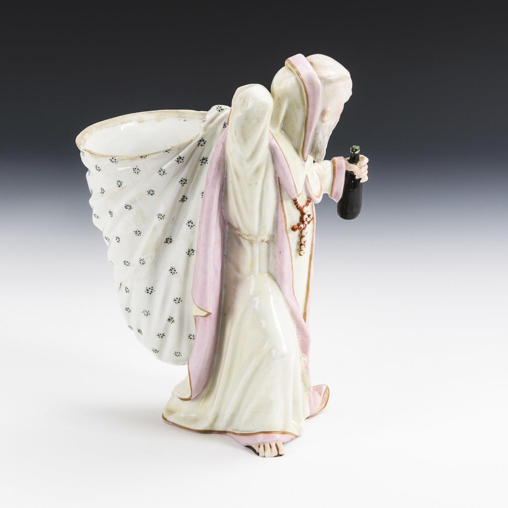 Laufender, eine Weinflasche tragender Mönch, auf seinem Rücken einen als Vase geformten Sack geschultert. Geklebter Ausbruch am Vasenrand, rechter Fuß bestoßen, partiell minimal berieben.
