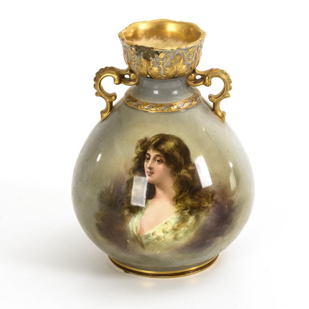Balusterform mit Reliefblütenhals und 2 rocaillierten Handhaben, schauseitig ein Damenporträt. Kleine Beschädigung am Mündungsrand, leichte Bereibungen.