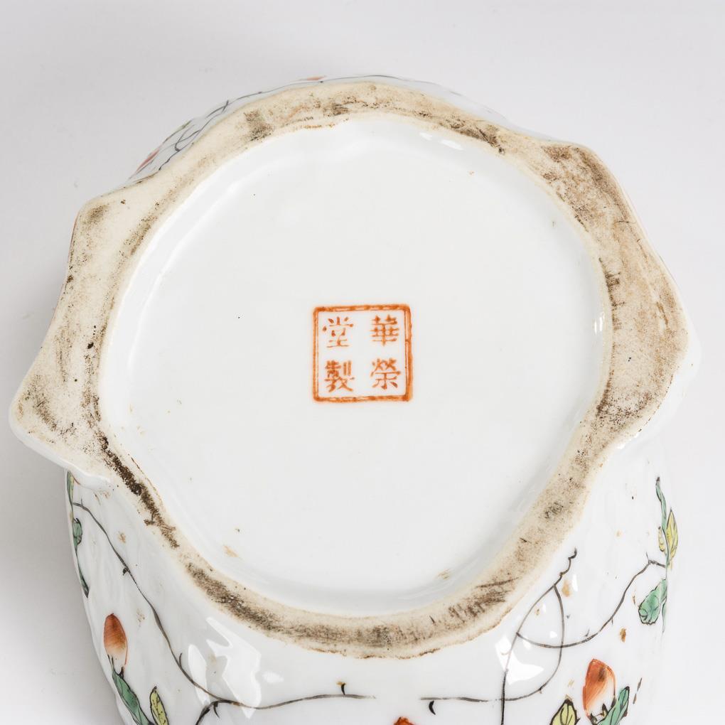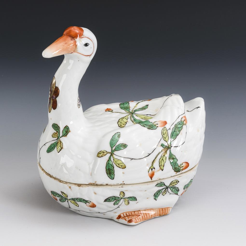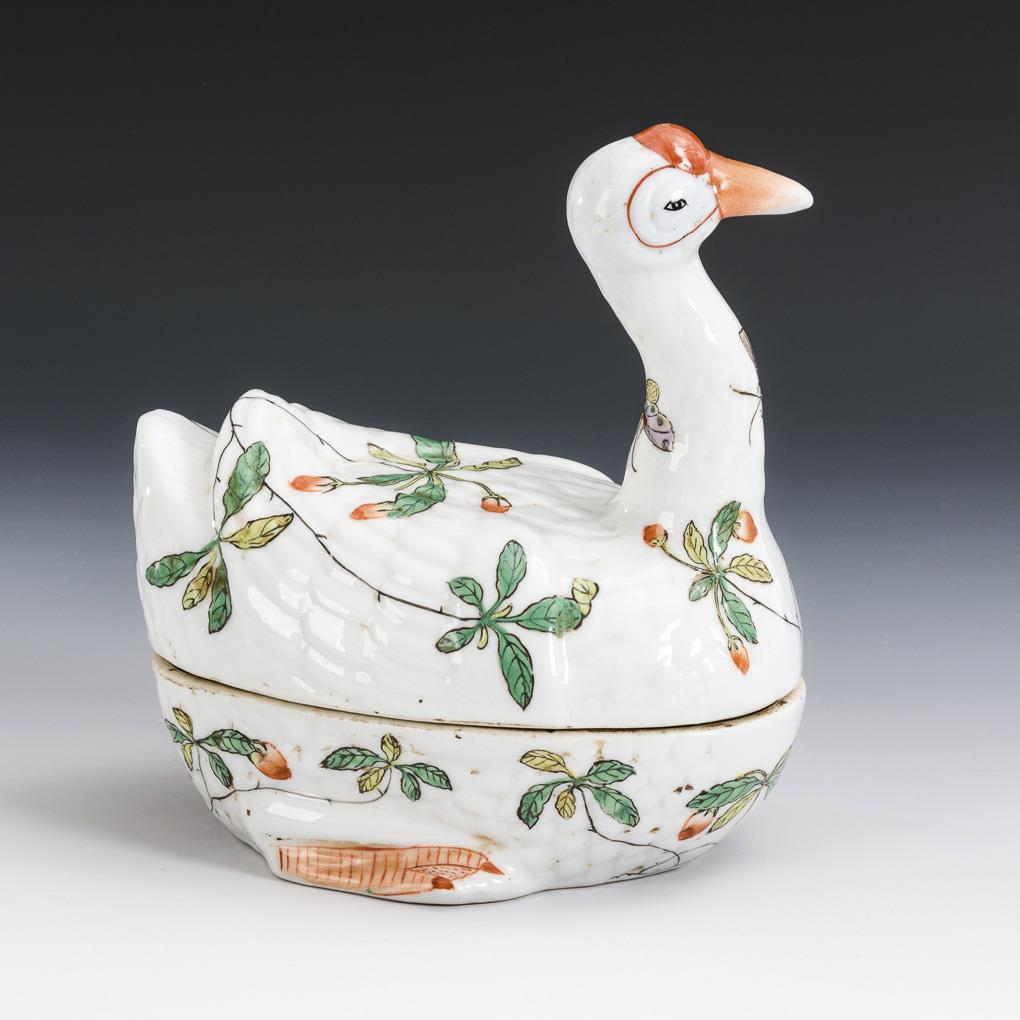 Zweiteilige Dose in Gänseform mit Schmetterlingen am Hals und Blätterdekor. Reliefierte Struktur des Gefieders .