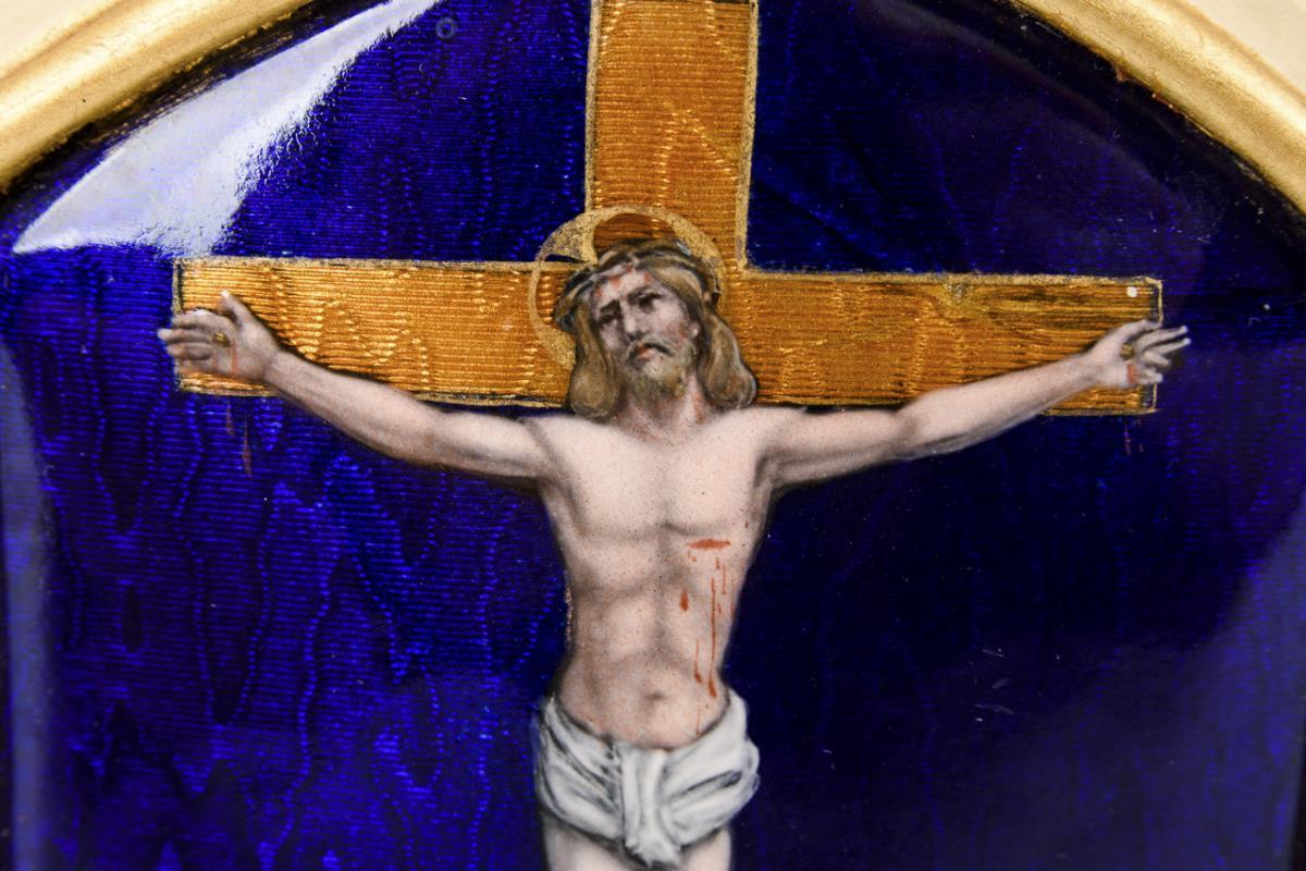 Mit intensiv leuchtenden Farben dargestellte Kreuzigung sowie Maria und Johannes auf den Flügeln.