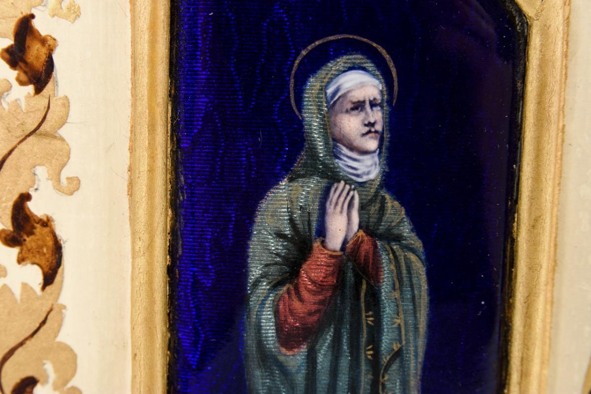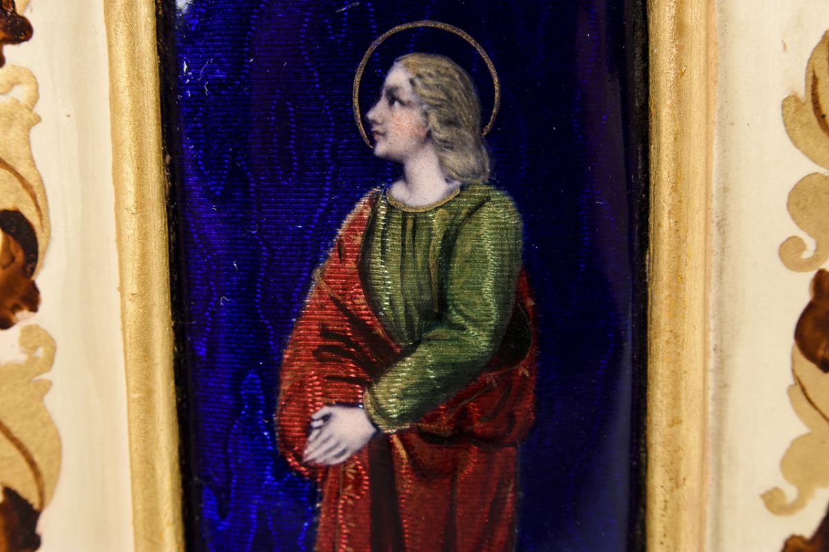 Transluzides Email über Druck und guillochiertem Grund. Holzrahmen weiß lackiert und goldbronziert mit gemalter Ranke. 17,5 x 26 cm.