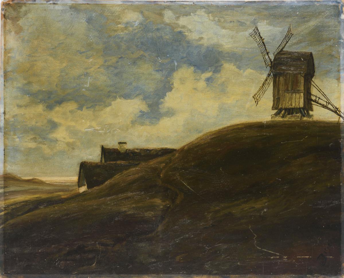 Farbliche Ausführung und Bleistiftstudie einer nackten jungen Frau, verso Landschaft mit Windmühle und Häusern nahe der Küste. Altersspuren.