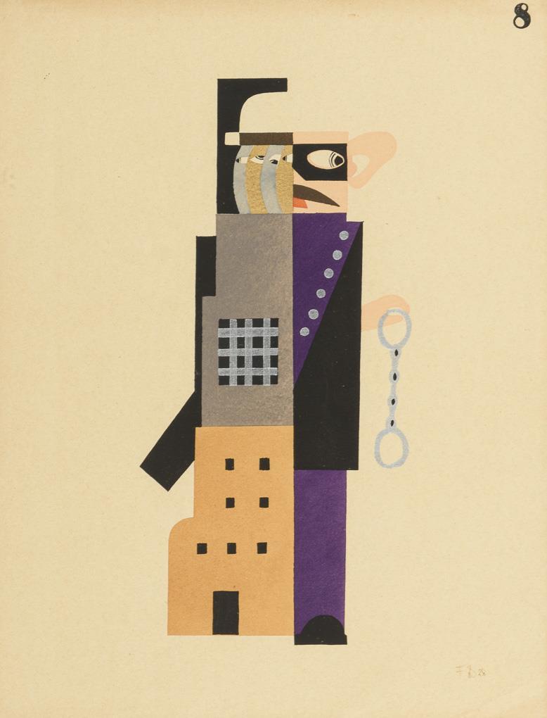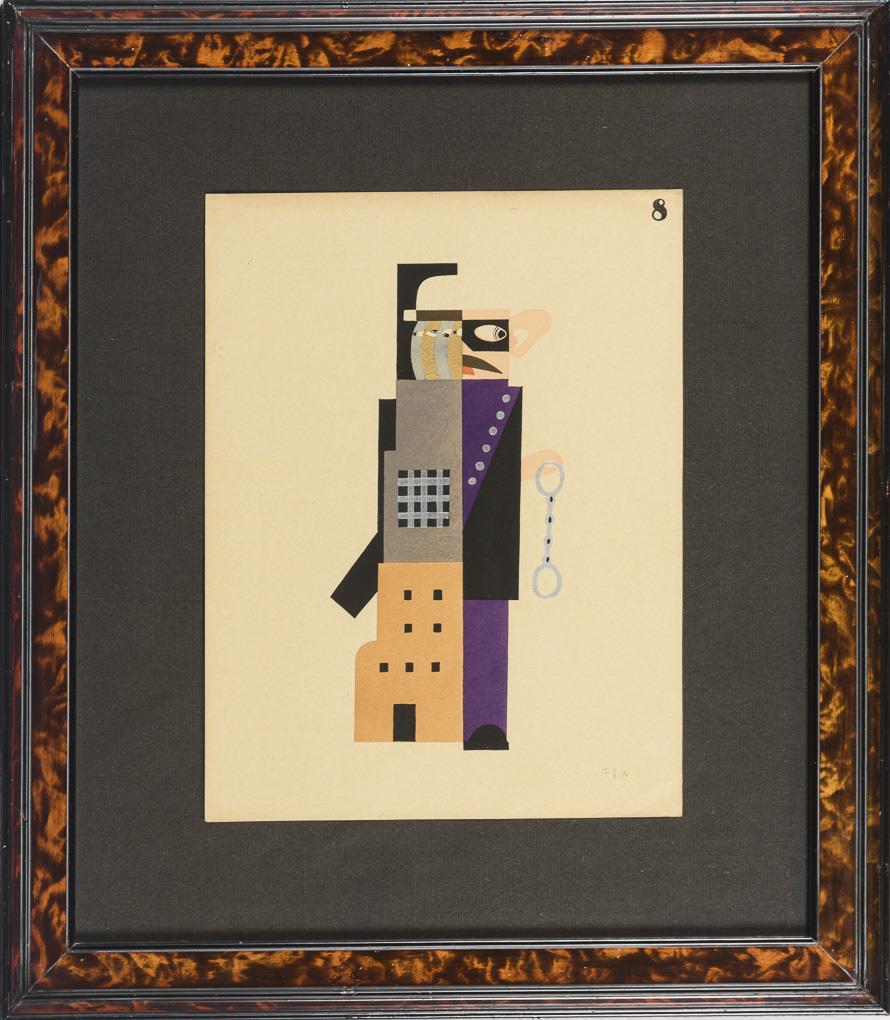1 von 12 personifizierten Darstellungen der Feinde des Sozialismus: "Die Spioniererei", Blatt 8 aus der Folge "Jeu de massacre", Brüssel 1928. Etwas griffspurig, Ecke unten rechts mit Knick.