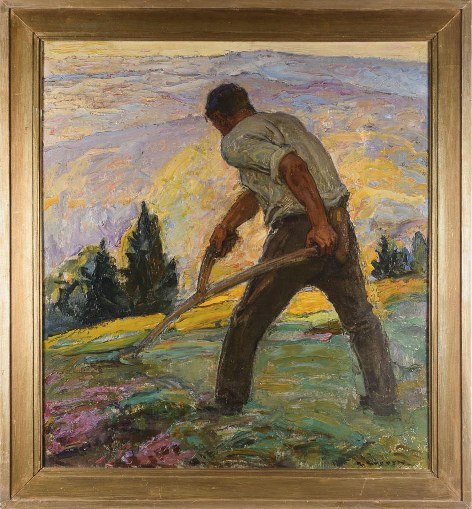 Der Bauer mit der Sense auf der Wiese in bergiger Landschaft. Leichte Altersspuren.