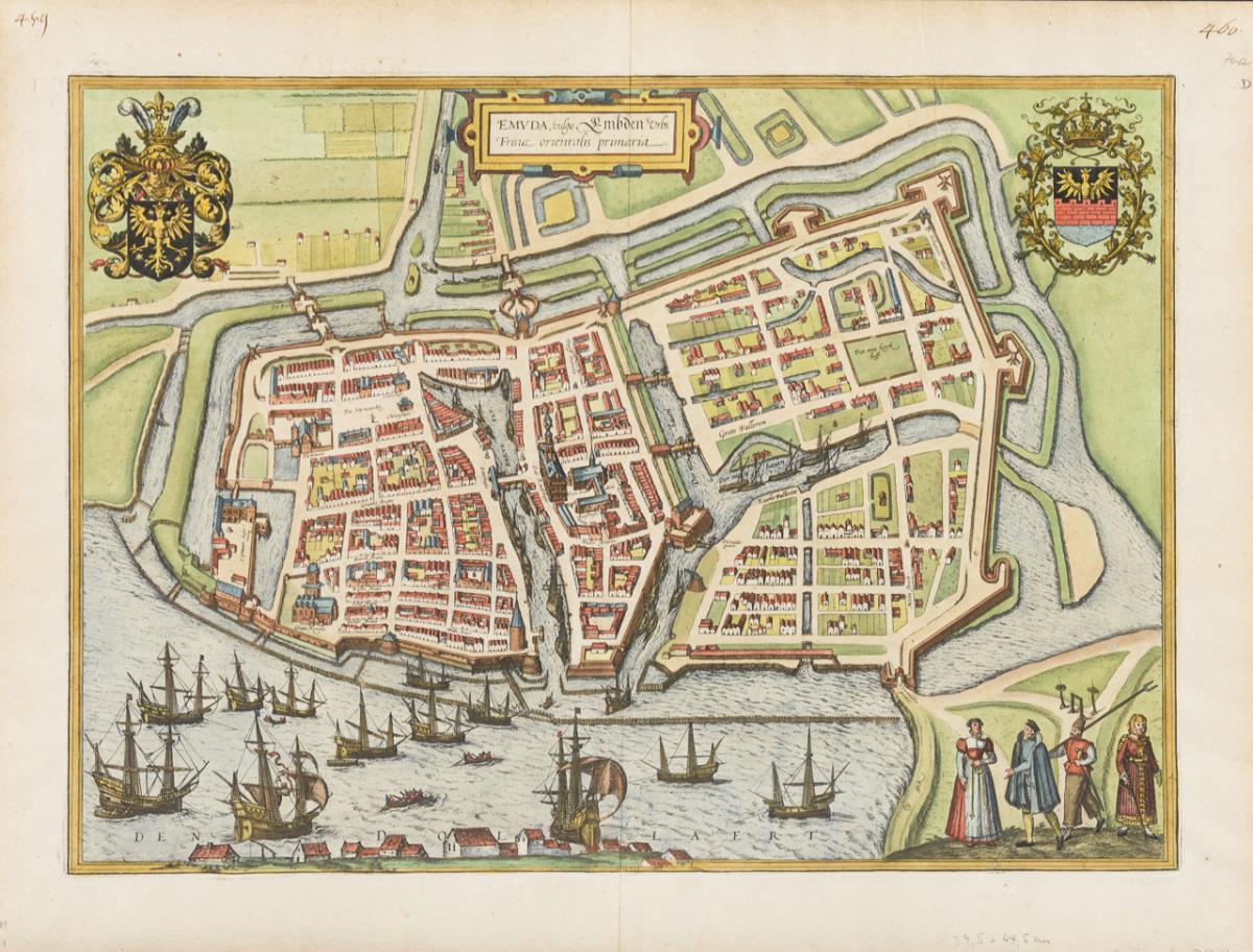 Dekorative vogelperspektivische Darstellung der Stadt Emden innerhalb der Stadtmauern, mit Titelkartusche "Emvda vulgo Emden urbs [...]", verso mit Beschreibung in lateinischer Sprache; aus "Civitates Orbis Terrarum", 1572 - 1618. Bugfalte, Randbereich griffspurig.