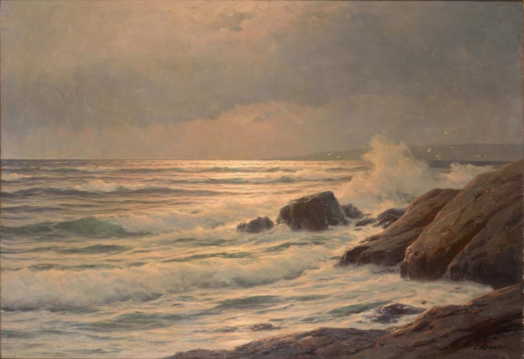 Stimmungsvolles Abendlicht über den Wellen an der felsigen Küste. Eine kleine Bestoßung.
