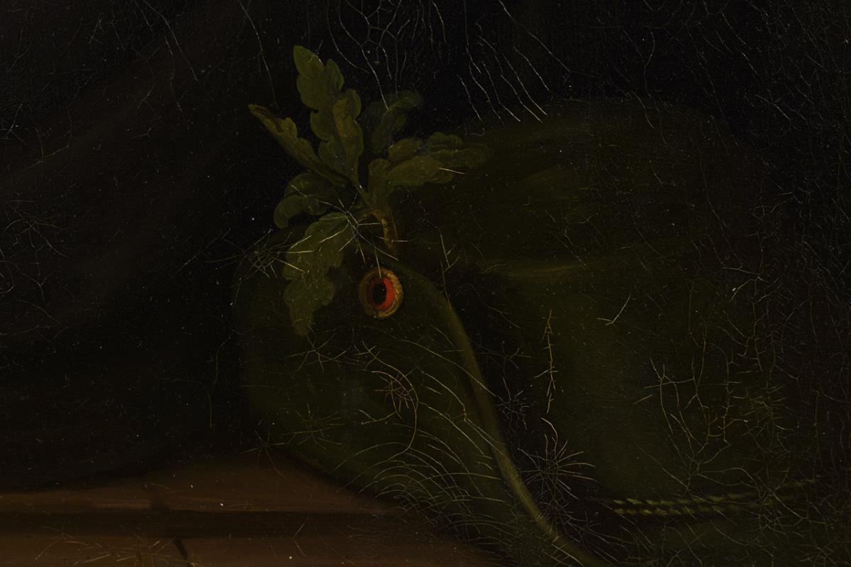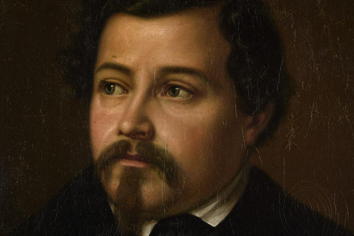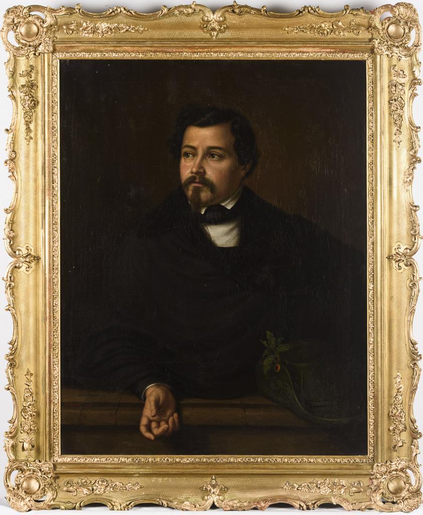 Porträt eines jungen Mannes in dunkler Kleidung mit abgelegtem Jägerhut. Altersspuren.