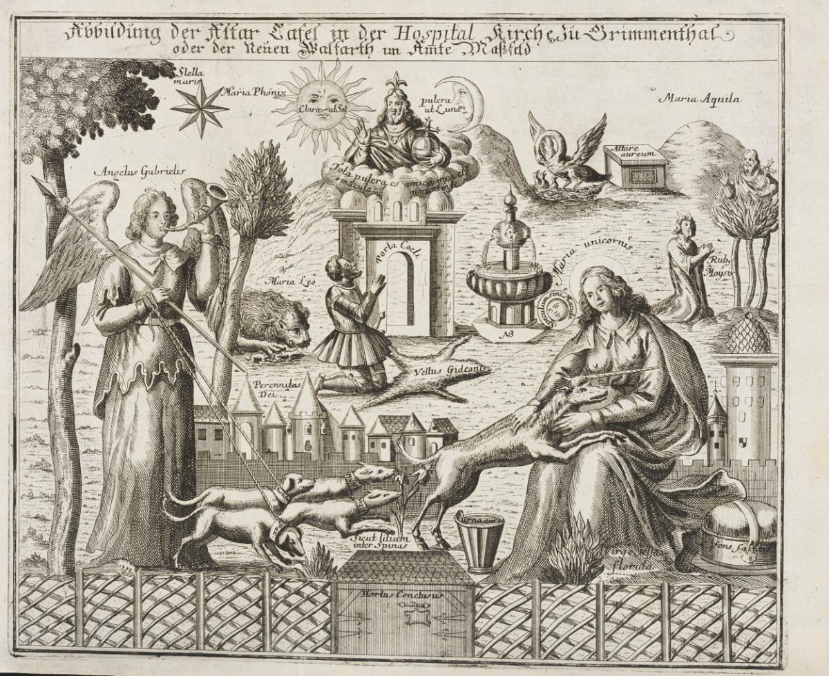 Abbildung des Hortus Conclusus mit zahlreichen Beschriftungen der Altartafel der Hospitalkirche im thüringischen Grimmenthal, die im Jahr 1758 einem Brand zum Opfer fiel, bezeichnet "Abbildung der Altar-Tafel in der Hospital Kirche zu Grimmenthal oder der Neuen Walfarth im Amte Maßfeld"; aus Friedrich Rudolphis "Gotha diplomatica oder ausführliche historische Beschreibung des Fürstenthums Sachsen-Gotha", 1717.