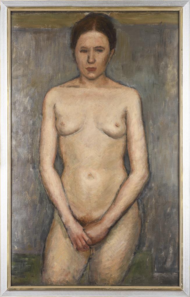 Stehende nackte, junge Frau mit vor der Scham verschränkten Händen im hellen Licht.