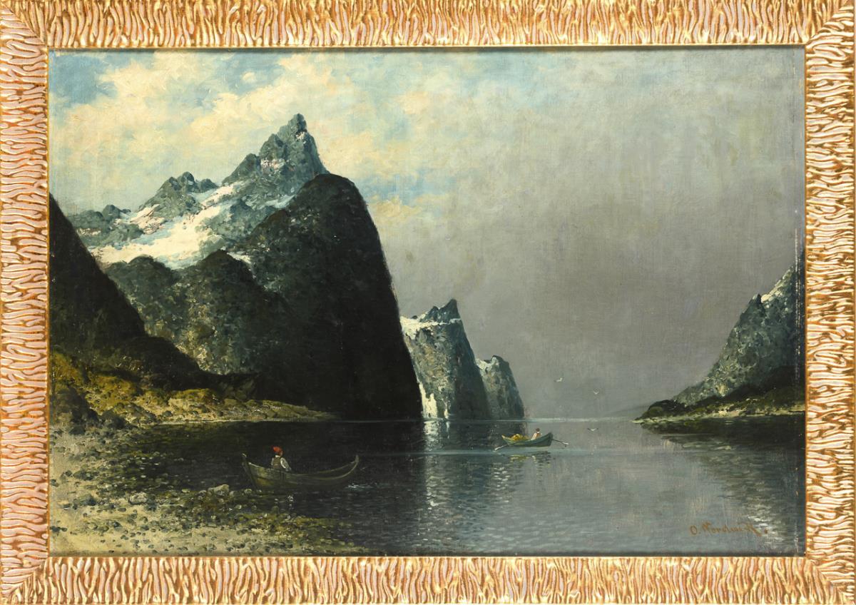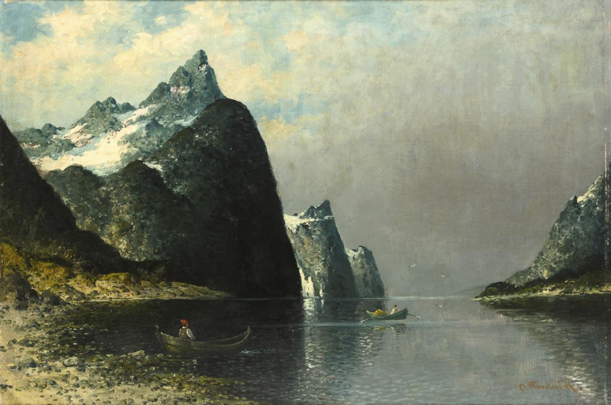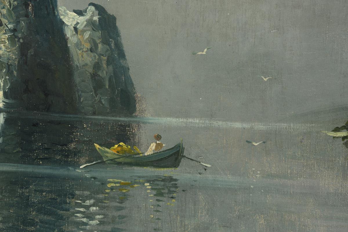 Fischer auf dem ruhigen Wasser des Fjords unter abziehenden Wolken. Leichte Altersspuren.