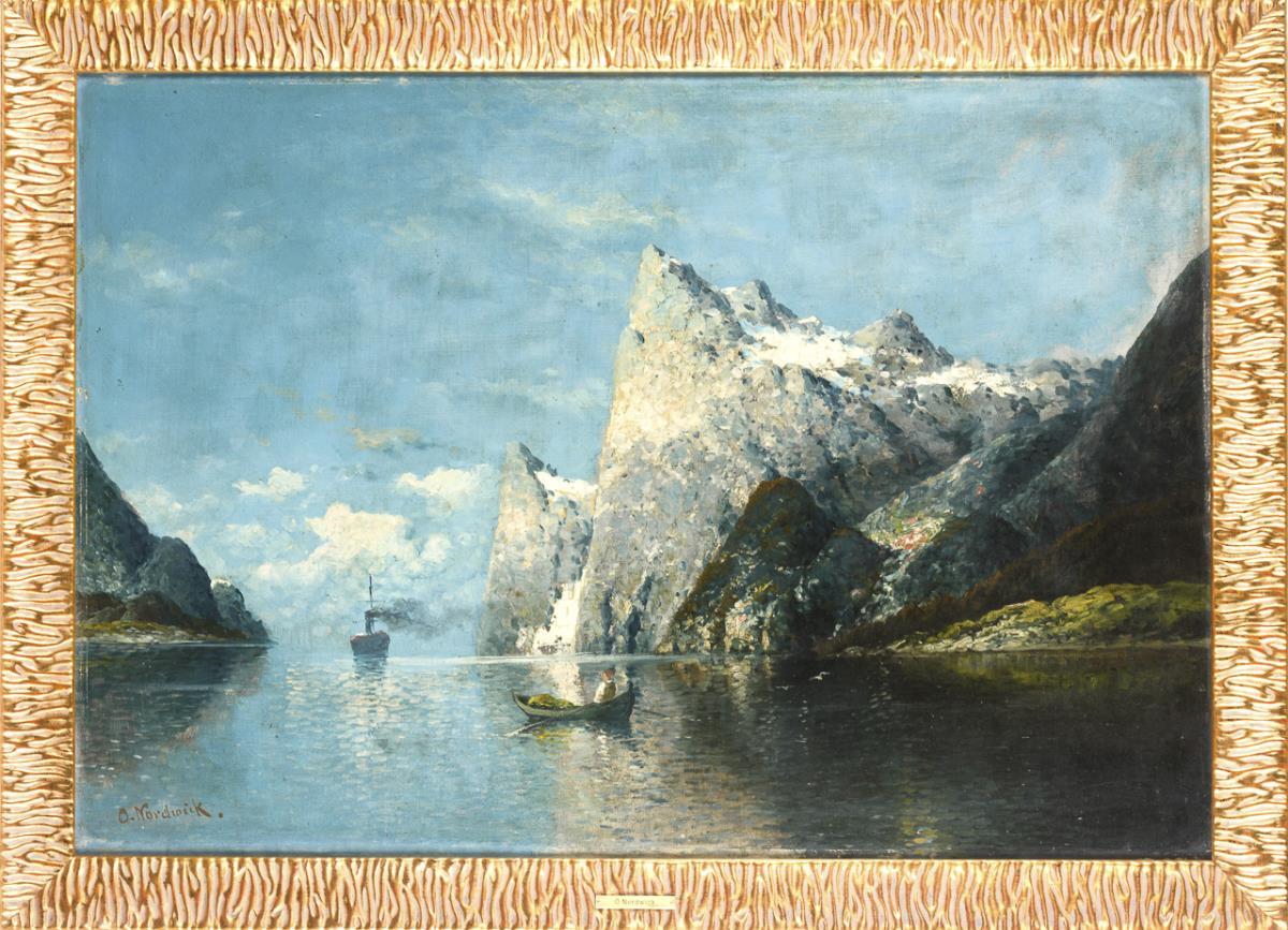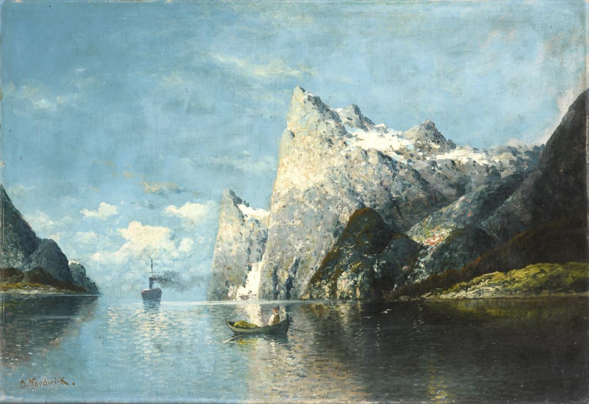Fischerboot und ein Dampfer zwischen den steilen Bergen des Fjords. Leichte Altersspuren.