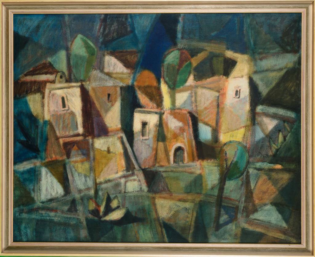 Farbkräftig und in geometrischen Formen dargestellte Stadt im Sonnenschein.