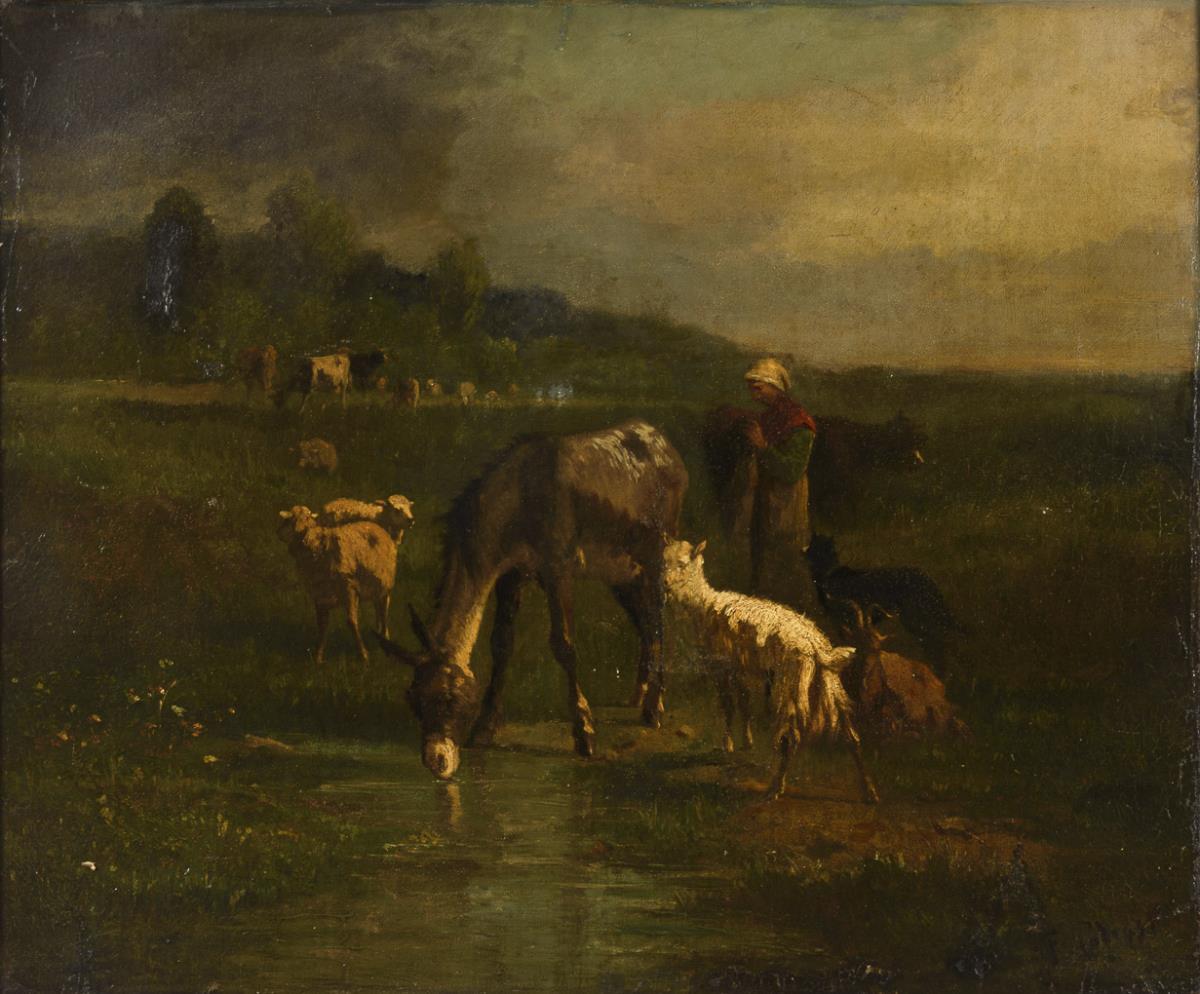 Die Tiere mit der Bäuerin im warmen Sonnenschein an einem seichten Gewässer. Leinwand doubliert.