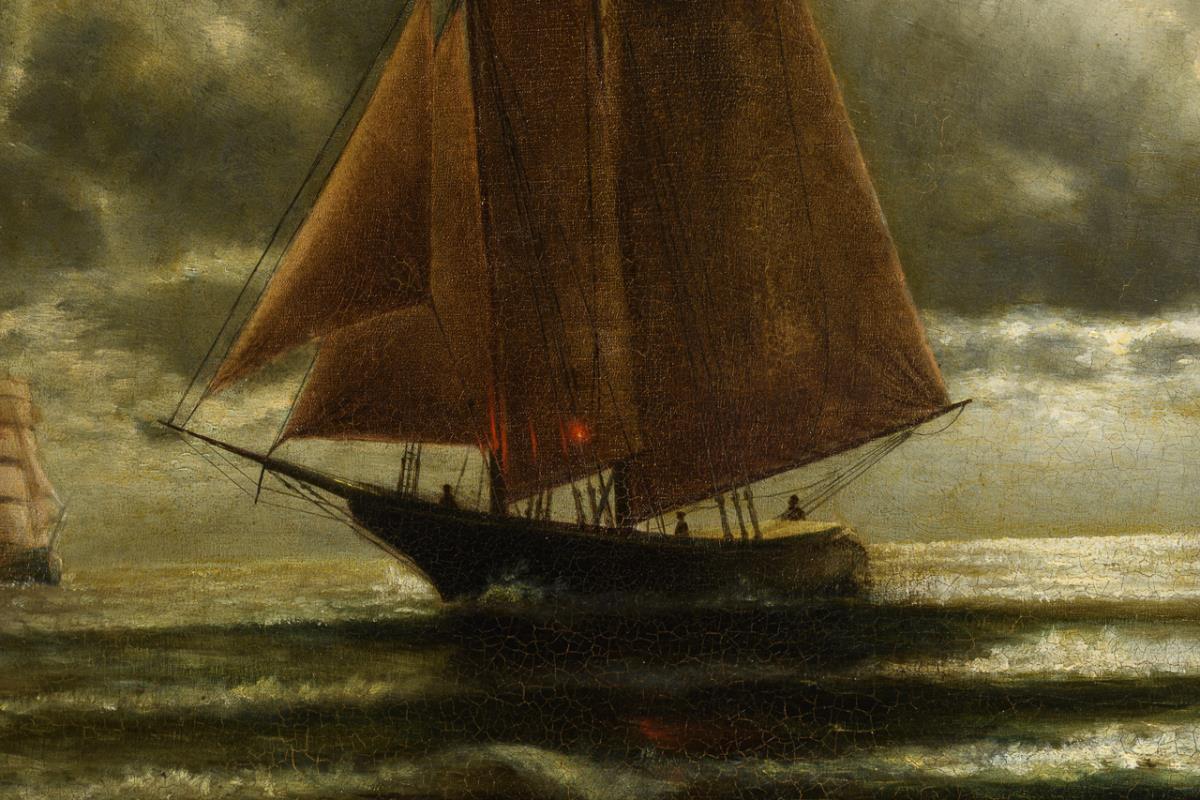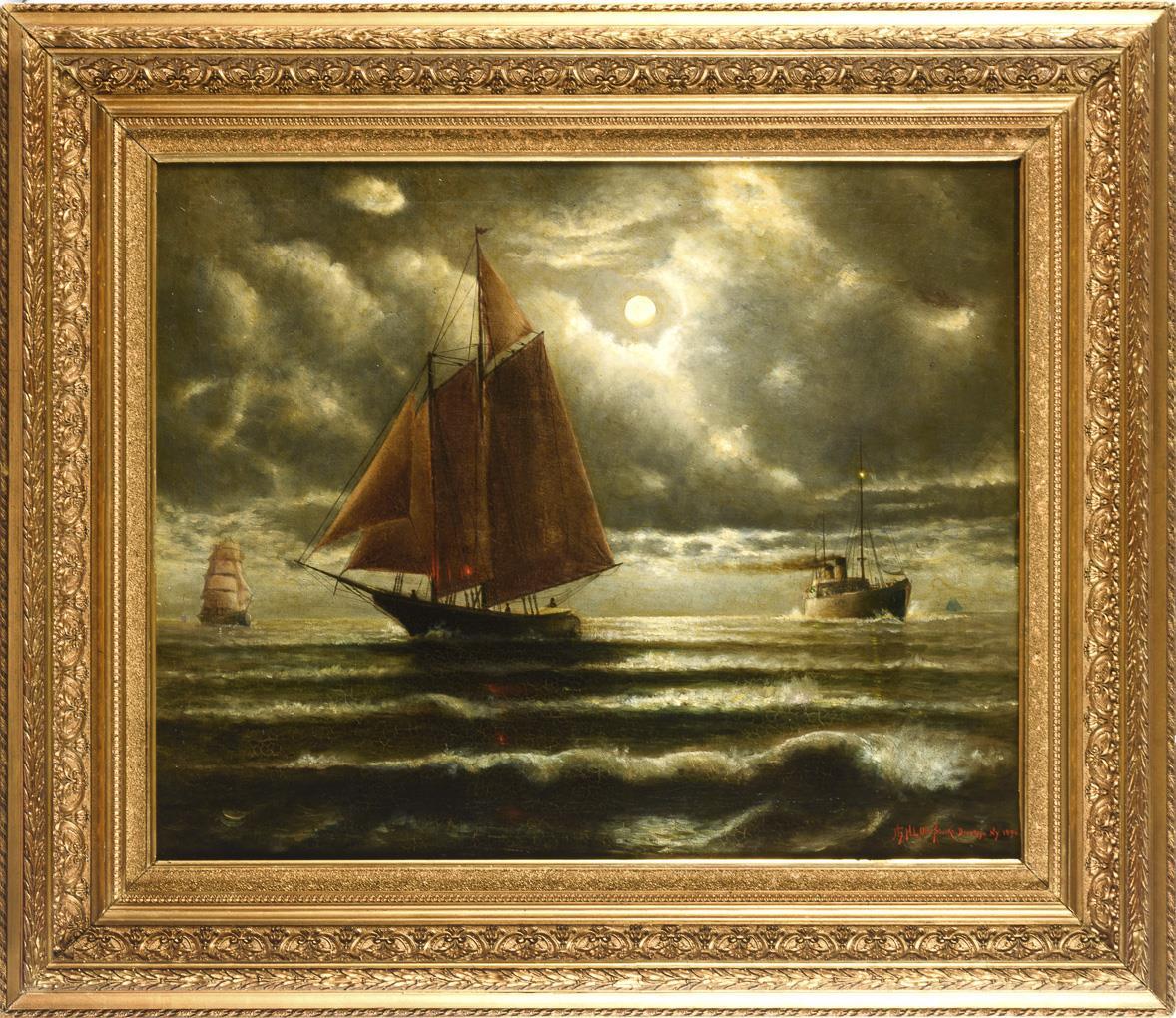 Segler und Dampfschiffe bei hellem Vollmond nahe dem Strand. Altersspuren.