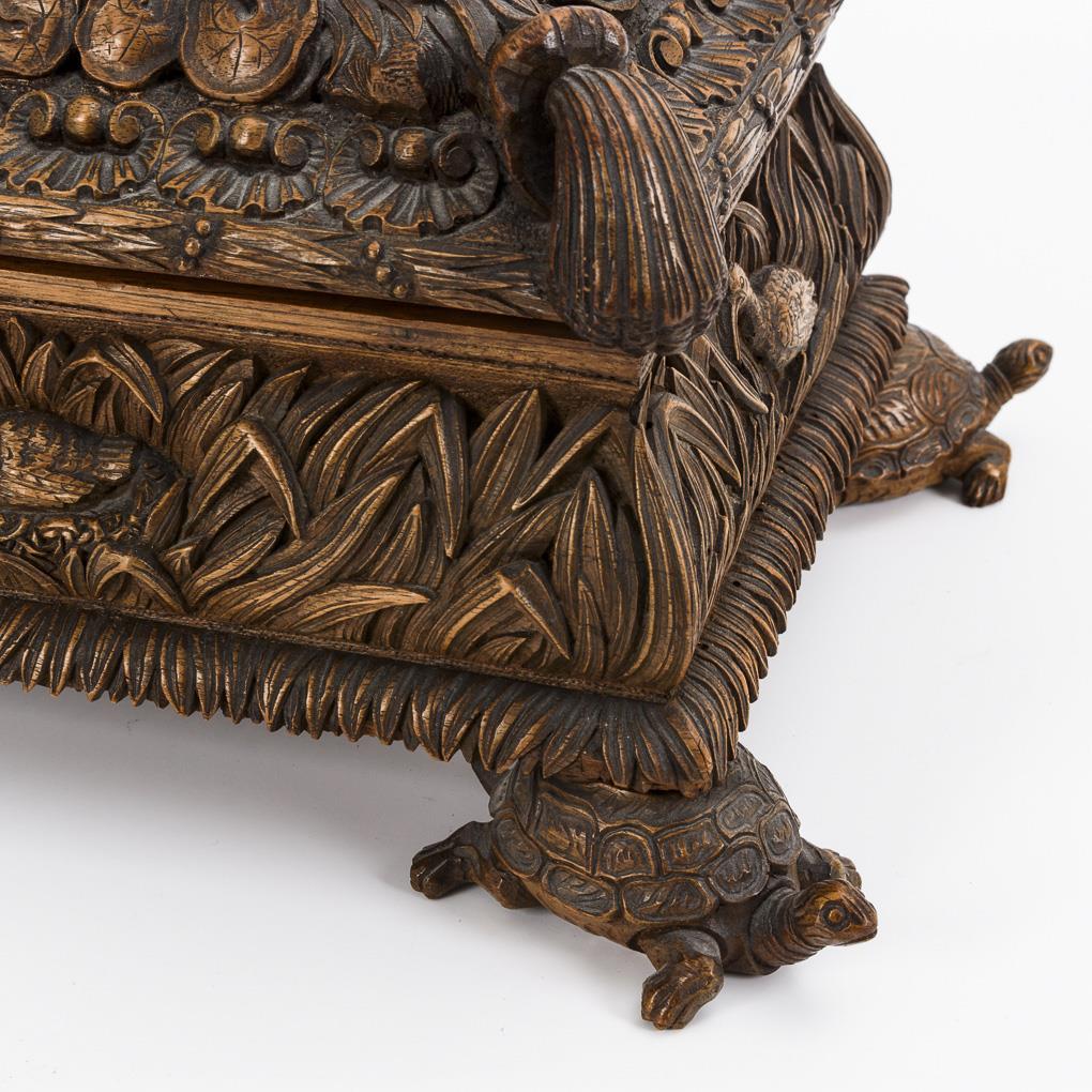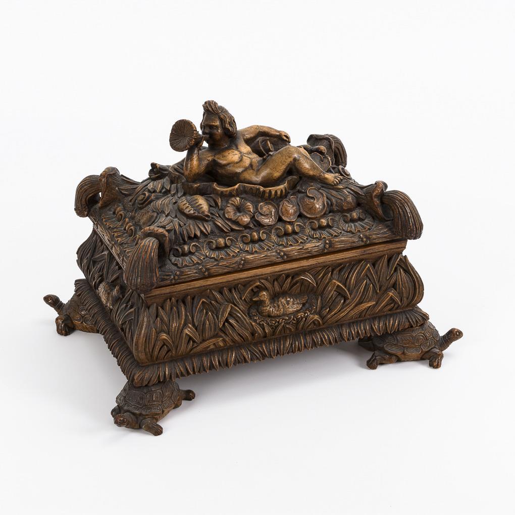 Allseits reich beschnitzte Schatulle mit dem Thema Wasser: Schildkröten-Füße, Schilfwandung mit Vögeln, auf dem Scharnierdeckel lasziv lagernder Knabe mit Fanfare in einer Muschel sowie Quellen an den Ecken. Einige Fehlstellen an den Schildkröten, Anobienspuren.