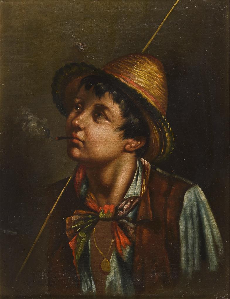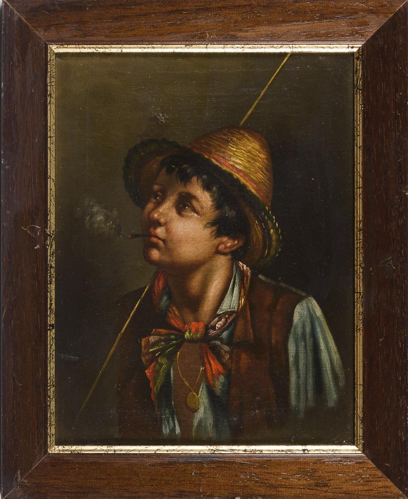 Bildnis eines jungen Burschen mit Angelrute und glimmender Zigarette im Mund. Restauriert.