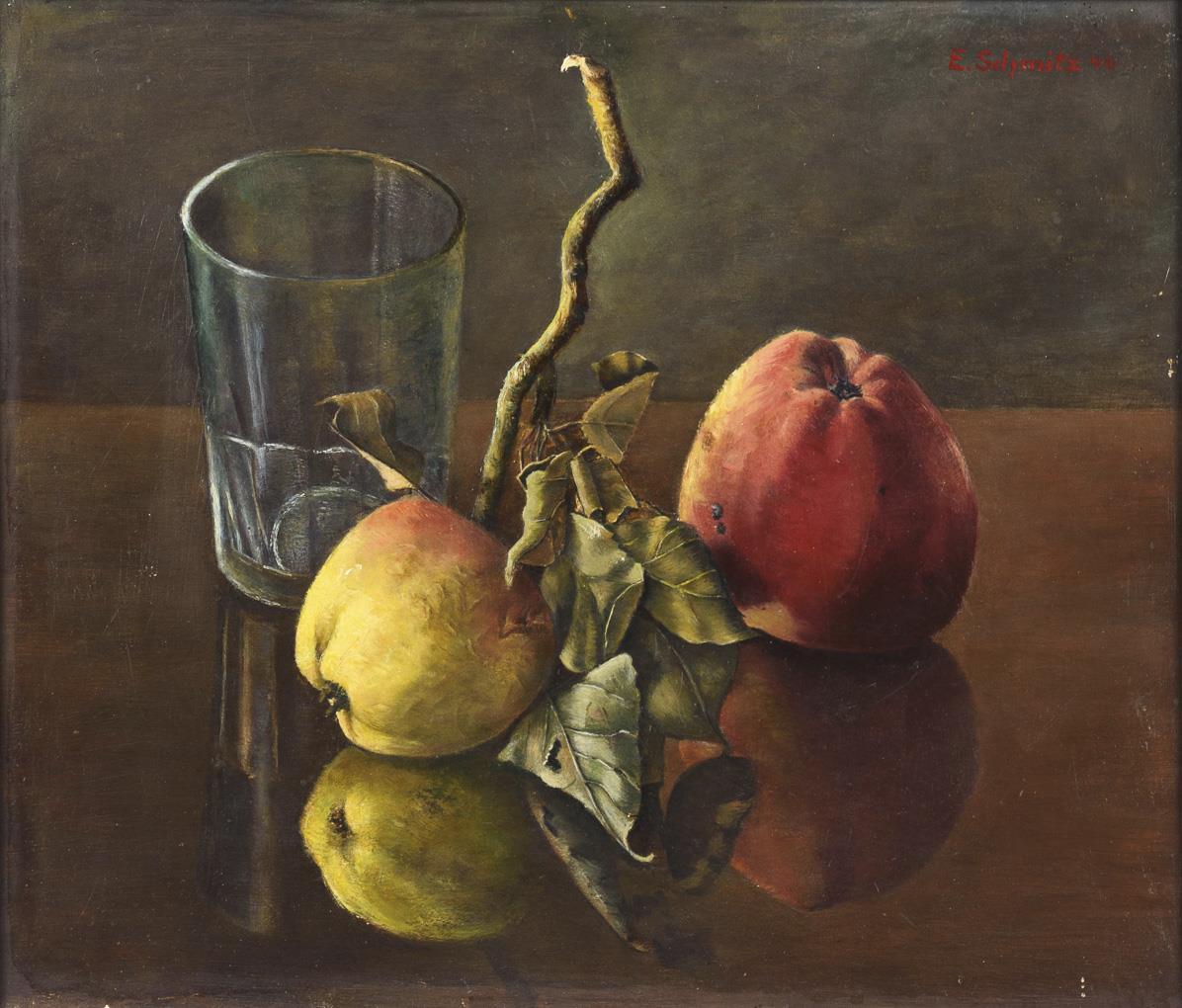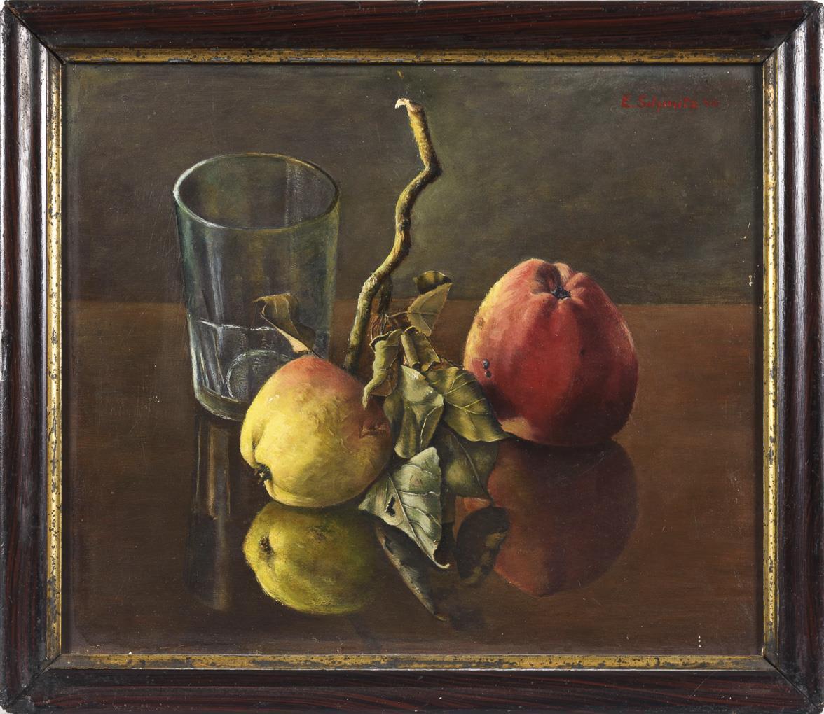 Teils an die Neue Sachlichkeit erinnernde Komposition aus Äpfeln mit Zweig und Blatt neben einem Glas. Leichte Altersspuren.