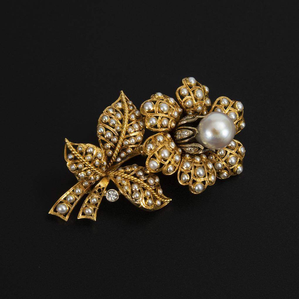 Blumenbrosche mit Zuchtperlen, Brillant und Diamanten.