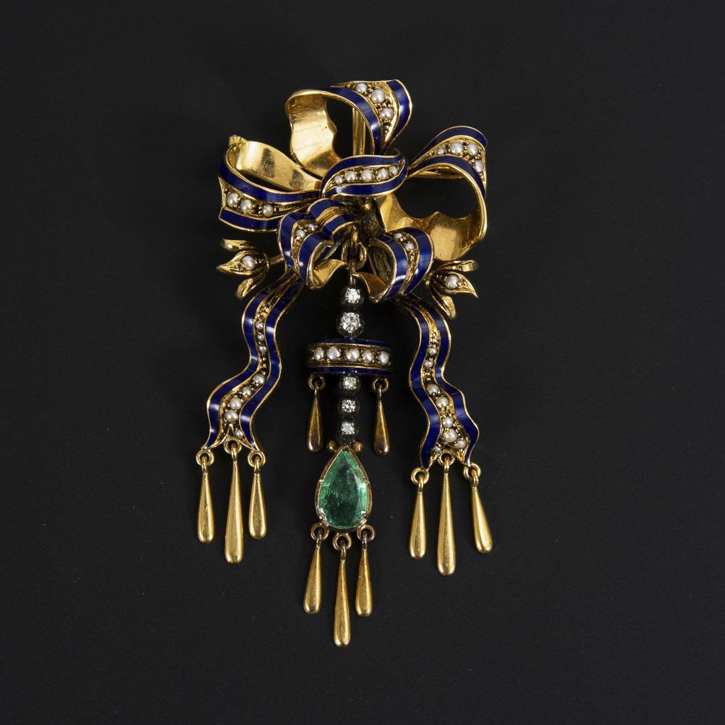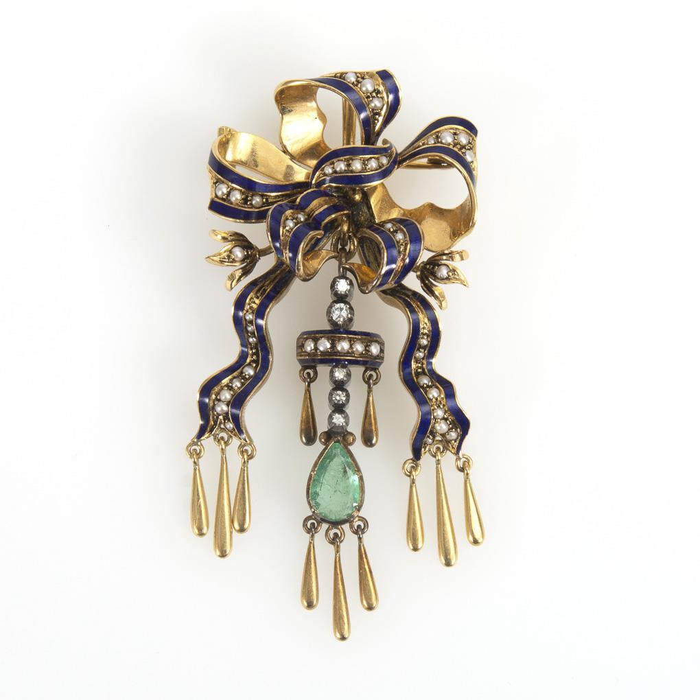 Historismus-Schleifenbrosche/Anhänger mit Smaragd, Diamanten, Perlchen und Email.