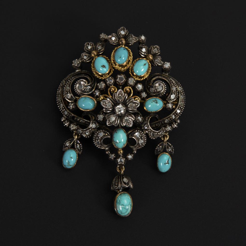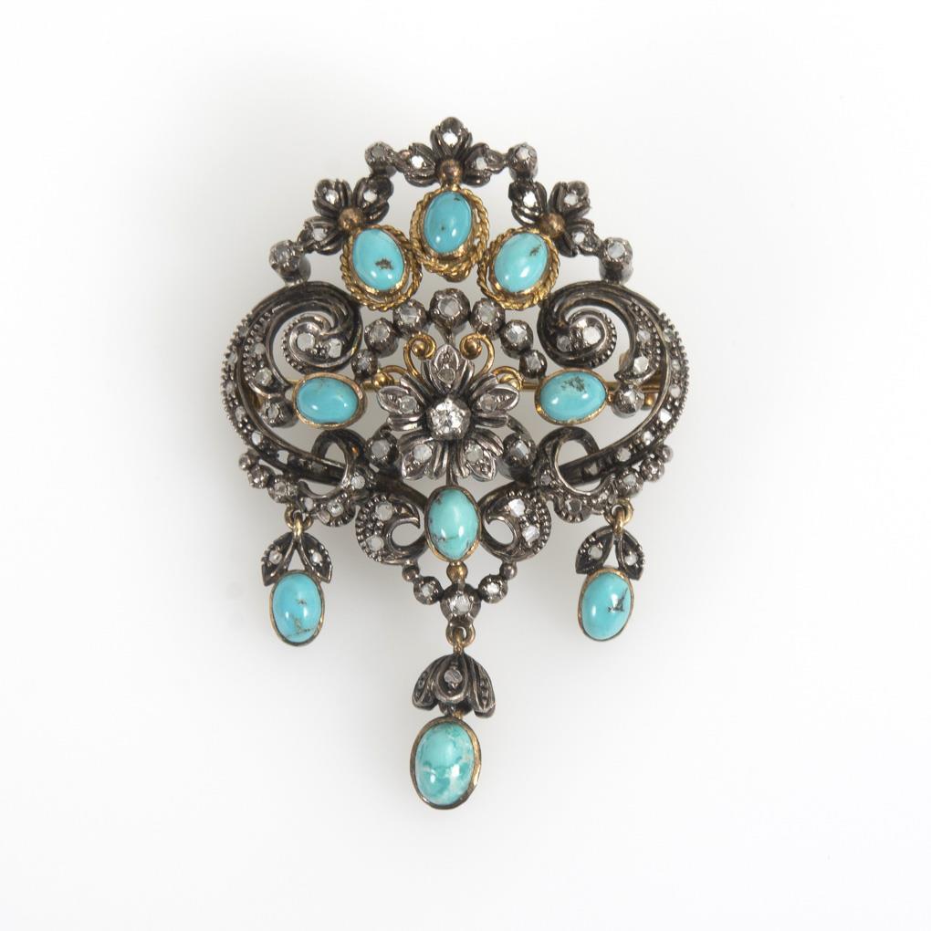 Ornamentbrosche mit Abhängungen, besetzt mit kleinem Brillant, diversen Rosendiamanten und zargengefassten Türkiscabochons. Kugelhaken, starre Öse.