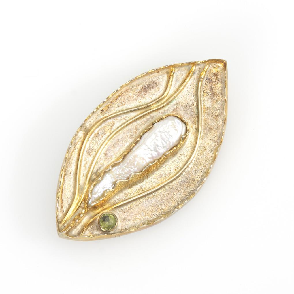 Stilisierte Blattbrosche mit Zuchtperle und kleinem Peridot. Starre Öse, Kugelhaken.