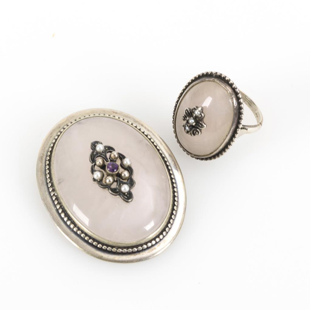 Anhänger/Brosche und Ring mit Rosenquarz.
