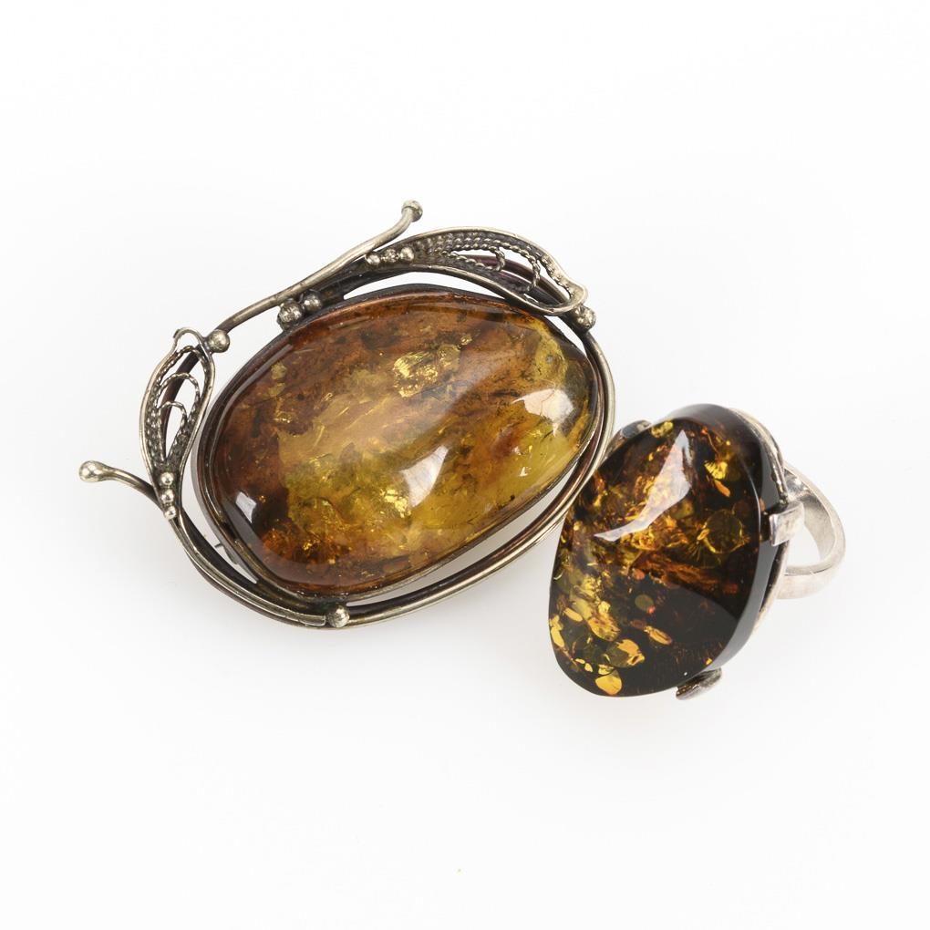 Silber geprüft. Silber 925 gestempelt. Ringgröße 58. Brosche 4,5 x 3,3 cm. 10,5/14,3 g.