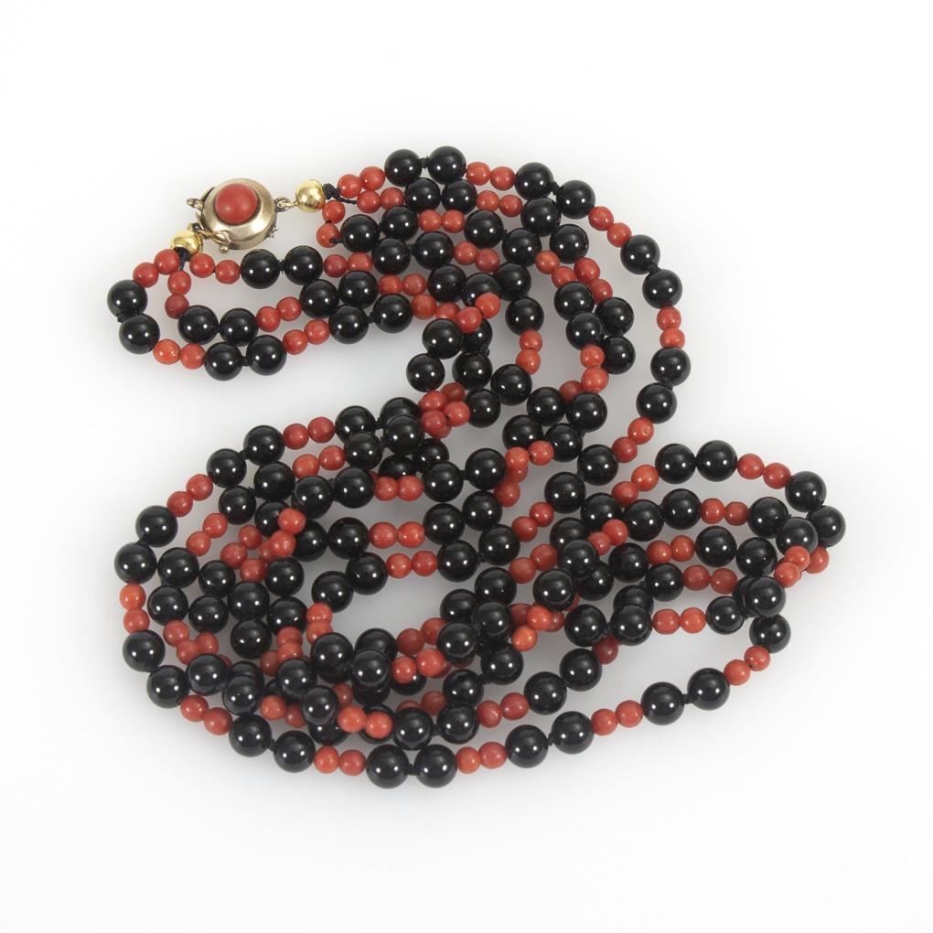 Schnürketten mit Onyxkugeln und kleinen Korallenkugeln, an Kastenschloss mit Achtersicherung.