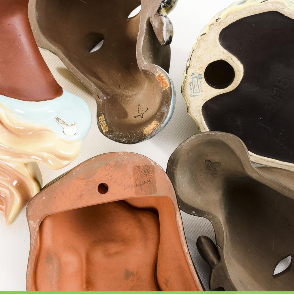 2x Karlsruher Majolika: dunkelhäutige Frauen. 1x Goldscheider West-Germany: Frau mit Kopftuch, 1953 bis 1960. 3x Cortendorf: Blonde Mädchen und dunkelhäutige Frau. 1 Maske mit Farbfehlstellen.