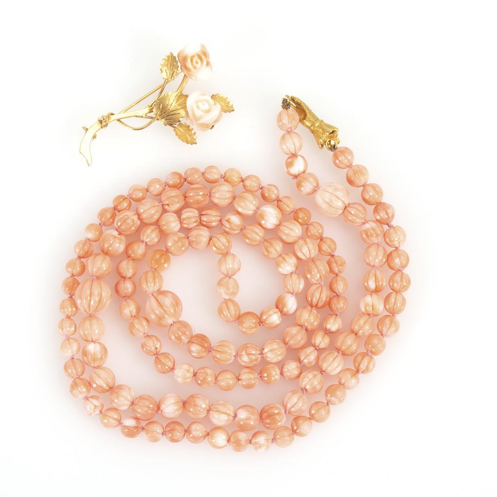 Gelbgold 585/750 geprüft. Kette L 88 cm. Korallen Ø 0,6/1 cm. Brosche 4,5 x 2,5 cm. 44/5,8 g.