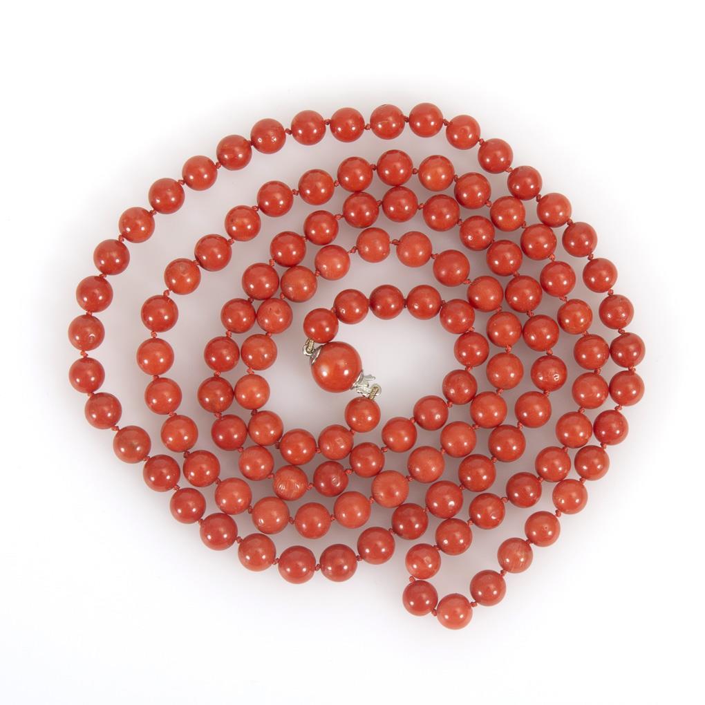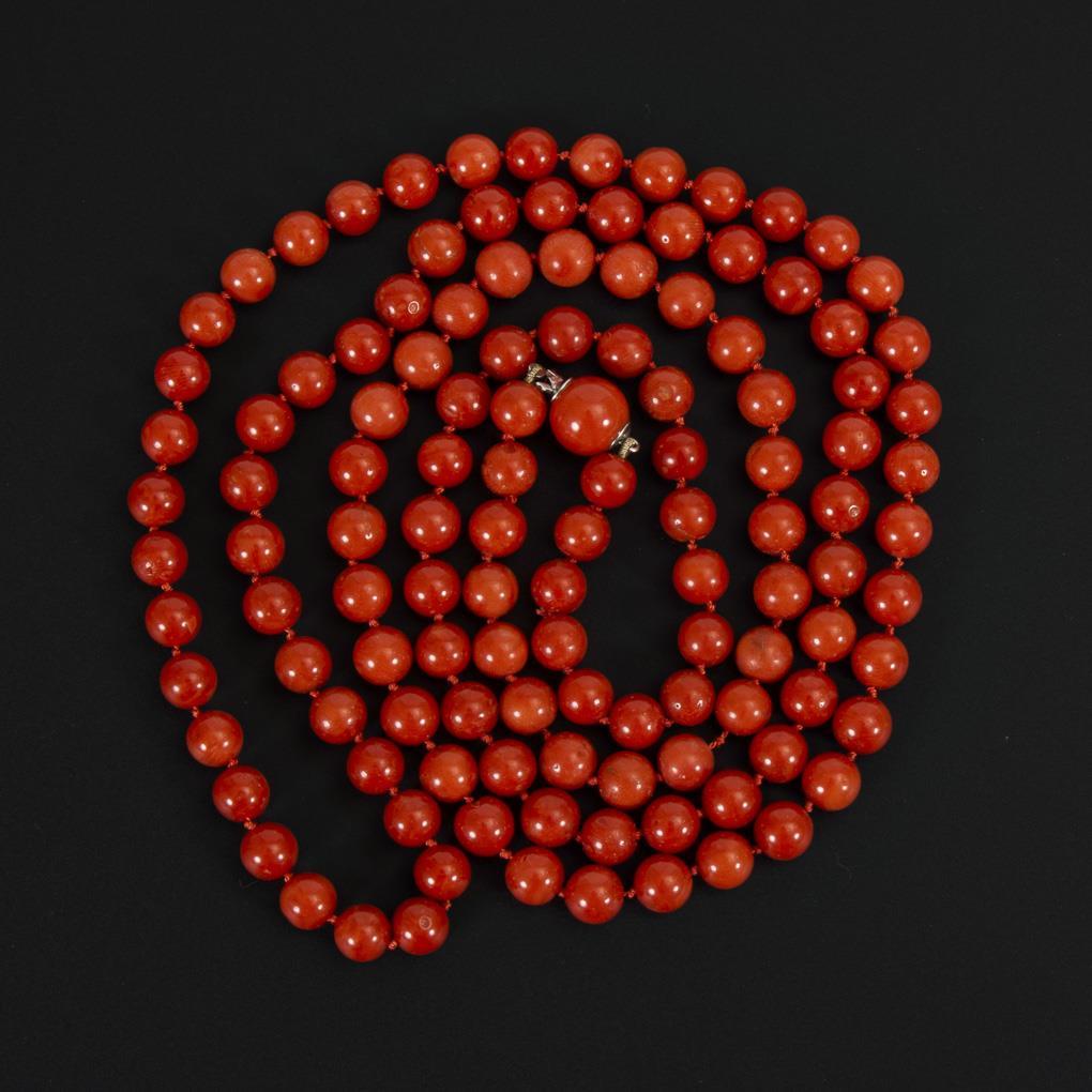Schnürkette mit Korallenkugeln in Einzelverknotung, an Kugelschließe.