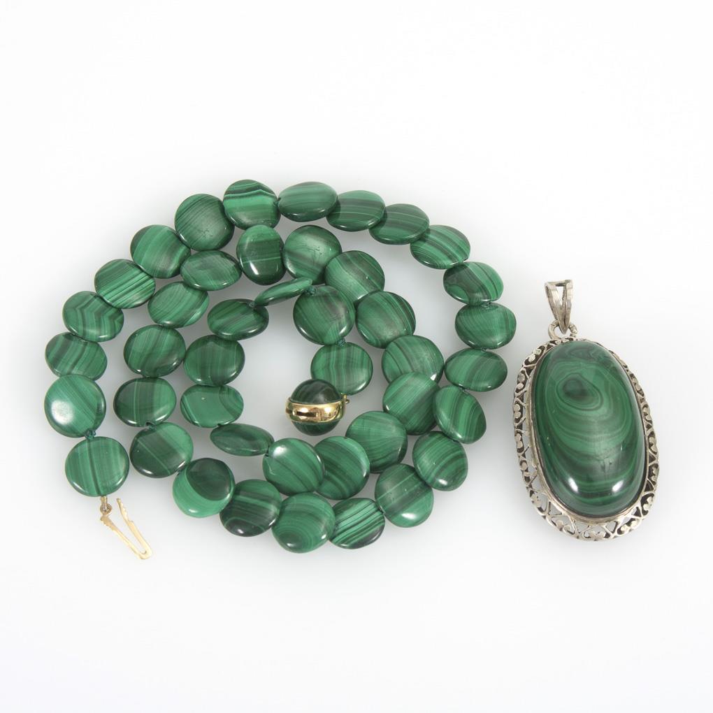 Schnürkette mit Malachit-Scheiben, an Kugelschließe. Großer Malachitcabochon in Zierrahmen.