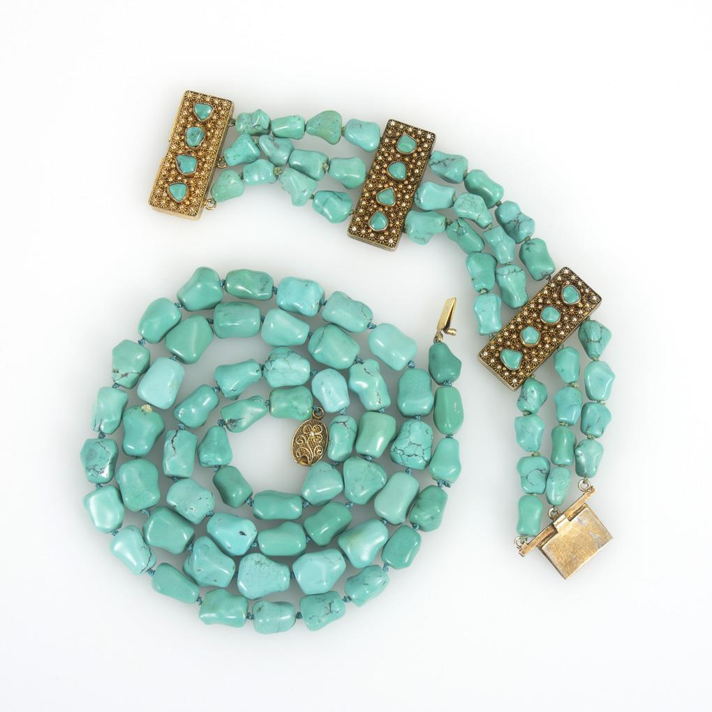 Schnürkette mit Matrix-Türkisen in Einzelverknotung, an Zierschließe. Türkisarmband mit canetilleverzierten Kastengliedern und Schloss.
