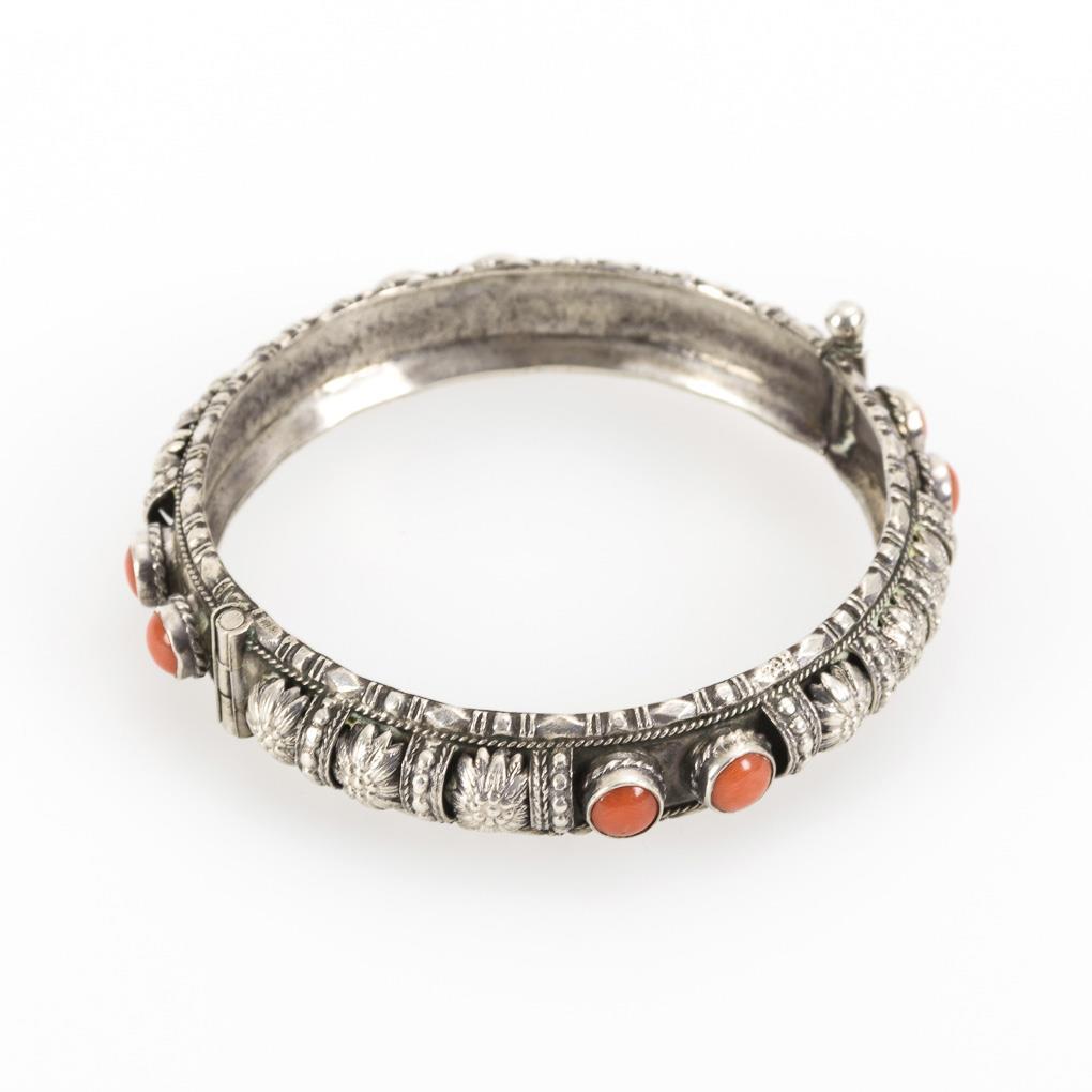 Runder Klappreif mit Reliefzier und kleinen Korallencabochons. Stiftverschluss.
