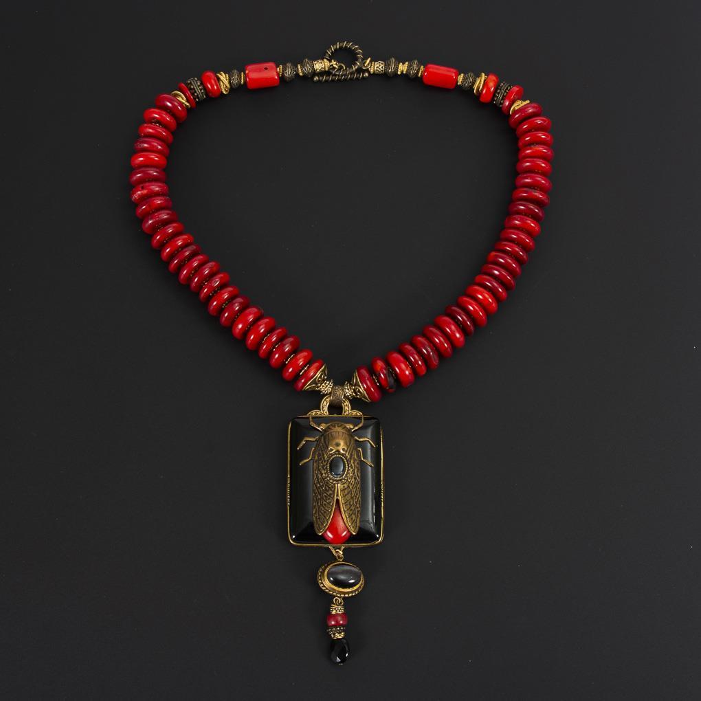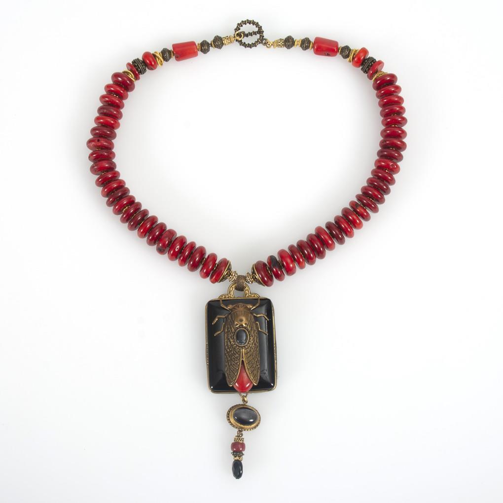 Schnürkette mit Korallen-Scheiben und Metall-Ziergliedern. Reliefierter Anhänger mit Glastafel, montierter Zikade und Abhängung. Knebelschließe. Metall.