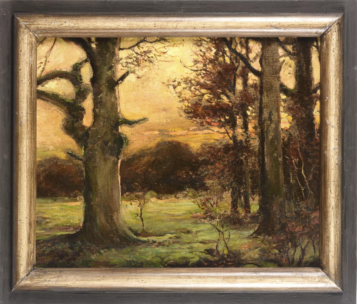 Der herbstliche Waldrand mit den Bäumen in Abendlicht. Leichte Altersspuren.