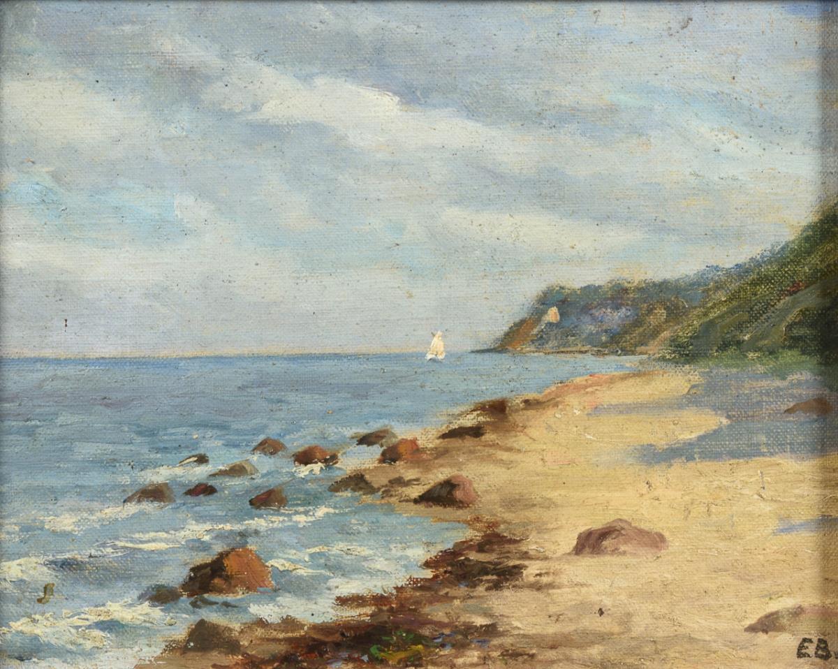 Sonniger Küstenstreifen mit Segler nahe dem Strand unter wolkigem Himmel. Minimale Altersspuren.