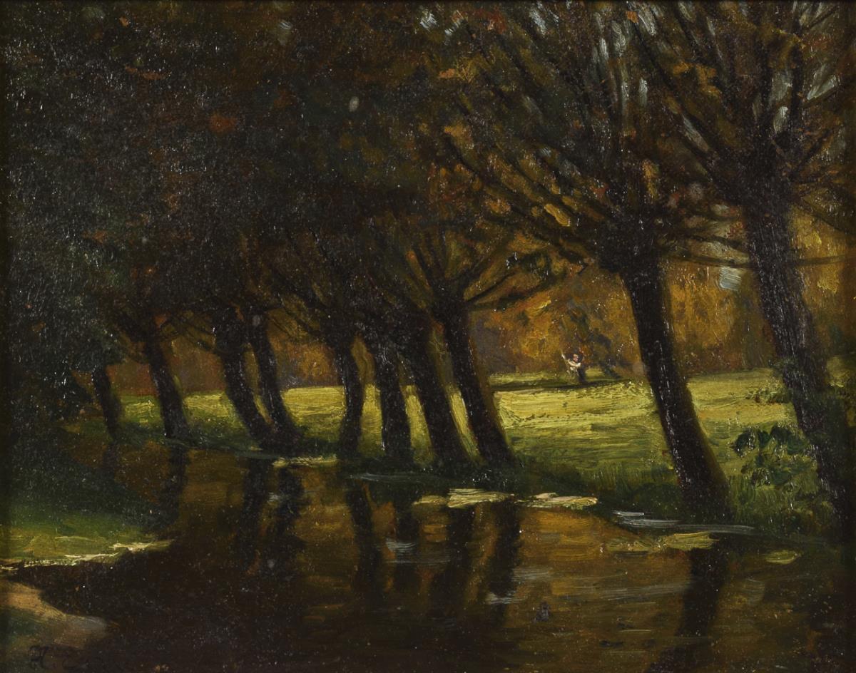 Breiter Bachlauf zwischen hohen Kopfweiden vor grüner Wiese mit herbstlichen Bäumen. Leichte Altersspuren.