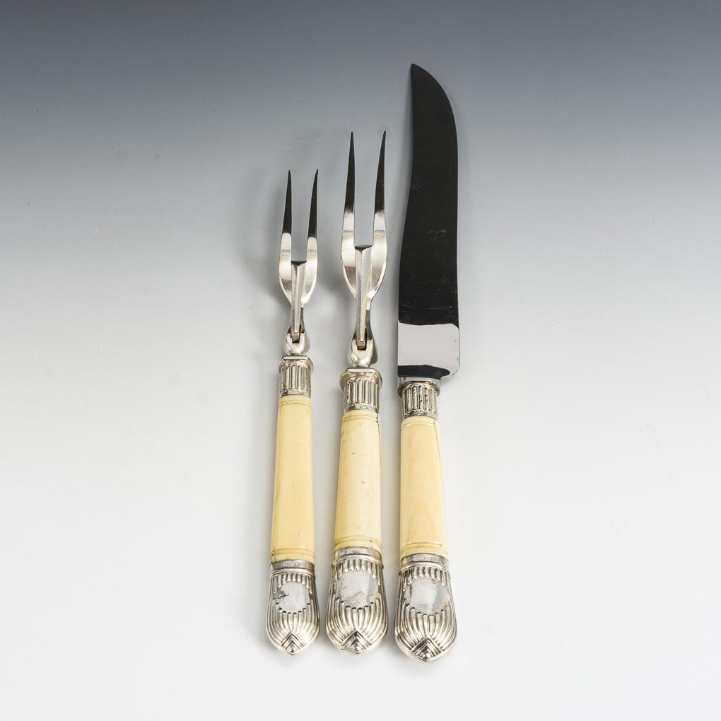 3-teiliges Tranchierbesteck (Messer und 2 Gabeln) mit gerippten Silbermontierungen an den Griffen. Griffe mit Trockenrissen, 1x leicht verfärbt.