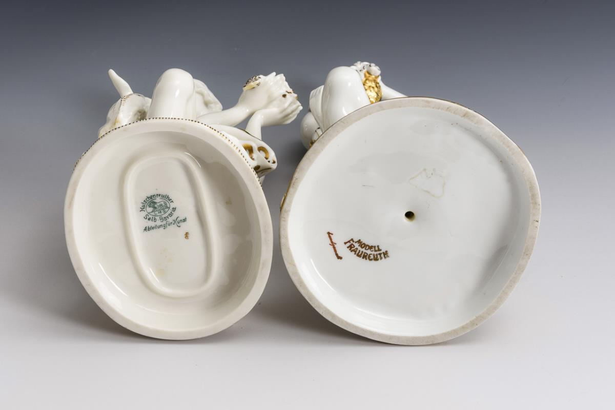 1x gemarkt "Modell Fraureuth": kniender, weintraubenessender Frauenakt (H 22 cm). / 1x gemarkt Hutschenreuther: neben einem Zicklein kniender Mädchenakt (H 20,5 cm). Hals und Kopf des Zickleins restauriert.