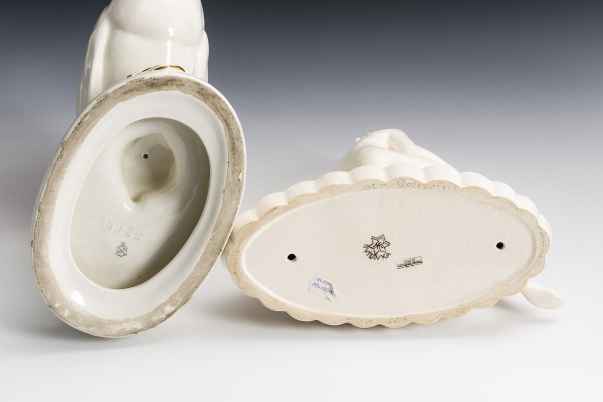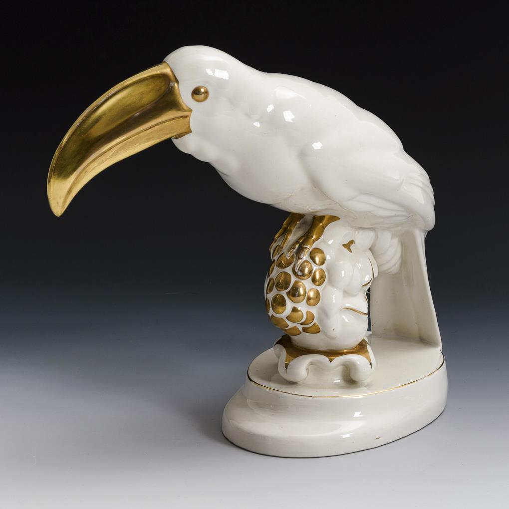 Goldstaffierter Tukan auf Ovalsockel, Majolika- und Steingutfabrik R. M. Krause, Ritzsignatur(?) auf Sockel, H 27 cm. Badende mit Hirschkuh auf geripptem Ovalsockel, gemarkt Svitavka, H 23,5 cm. Leicht goldberieben, minimaler Chip am Sockel des Mädchens.