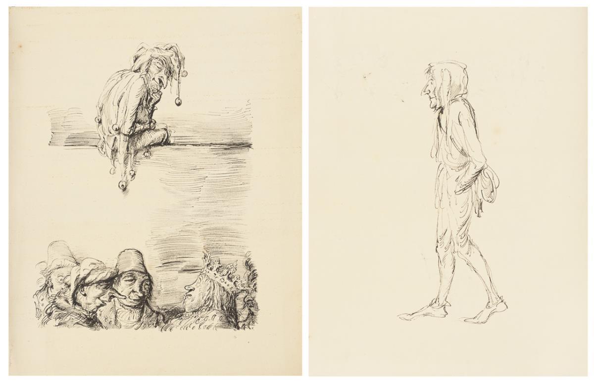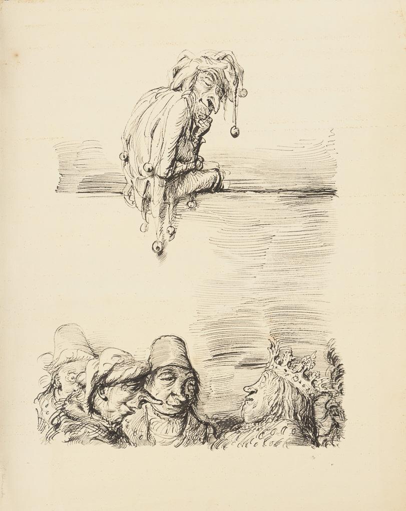 Recto: Narr, einen König im Gespräch mit drei Bauern beobachtend, verso: Studie Narr.