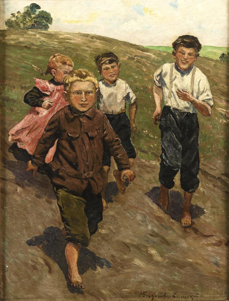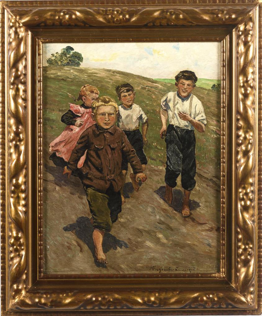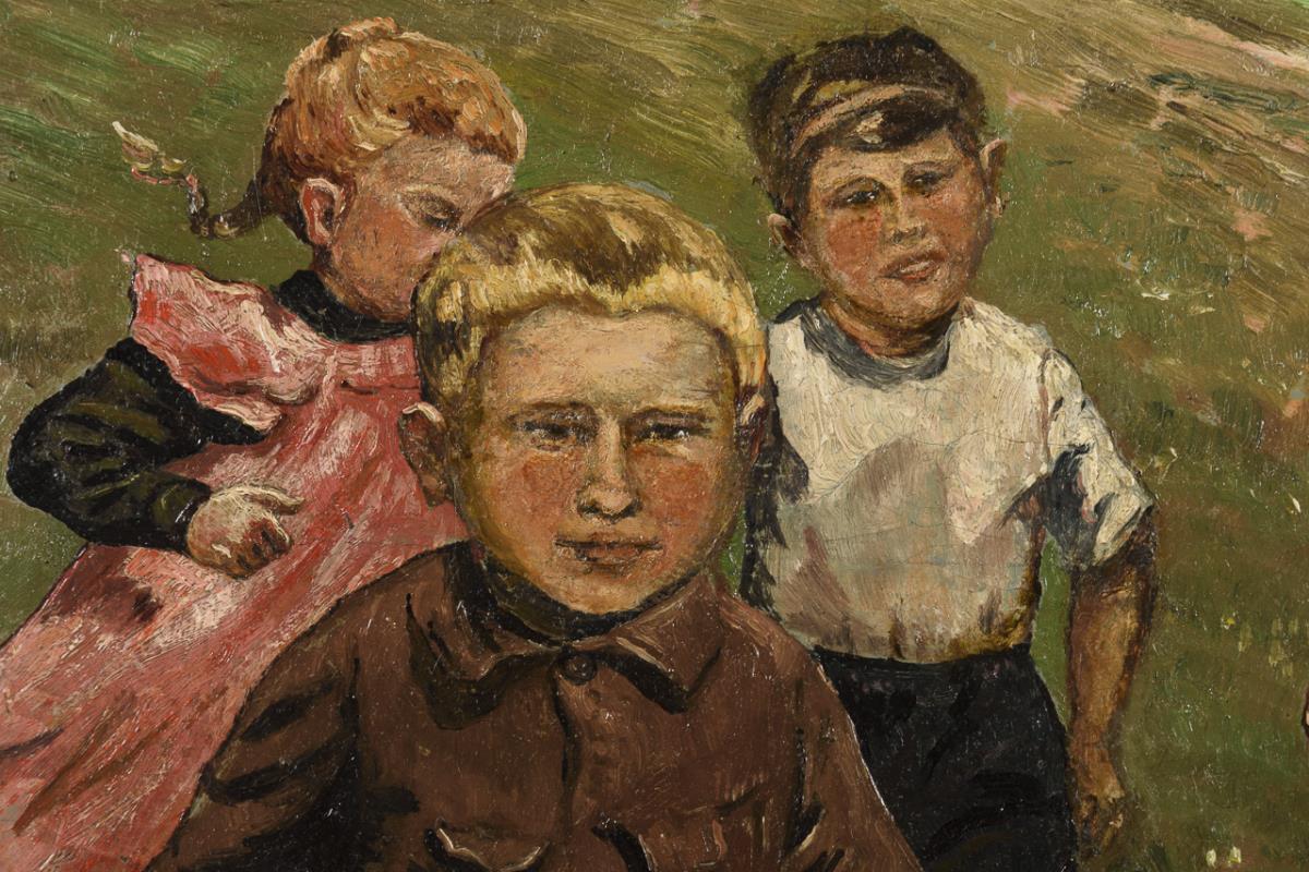 Die Dorfkinder in ausgelassener Stimmung im Sonnenschein auf einem Hügel. Ein kleiner Defekt.