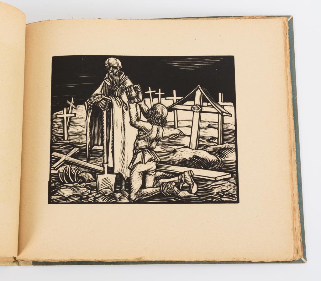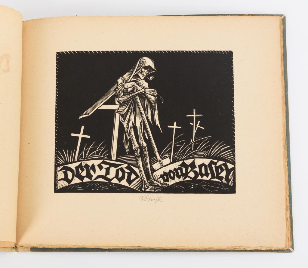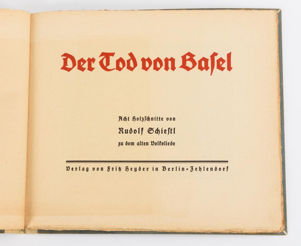 Gebundenes Buch mit 8 Holzschnitten zu dem Volkslied "Der Tod von Basel", Verlag von Fritz Heyder Berlin-Zehlendorf, Einband mit Buchtitel, 1 Holzschnitt mit Bleistiftsignatur, abwechselnd gebunden mit Abbildung und Textteil. Einband mit Altersspuren.