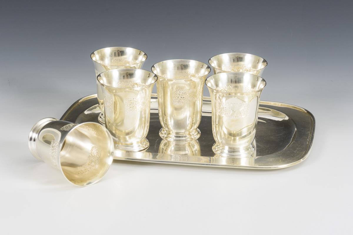 6 Silberbecher auf Tablett. Dresdner Silber und Metallveredlung GmbH.