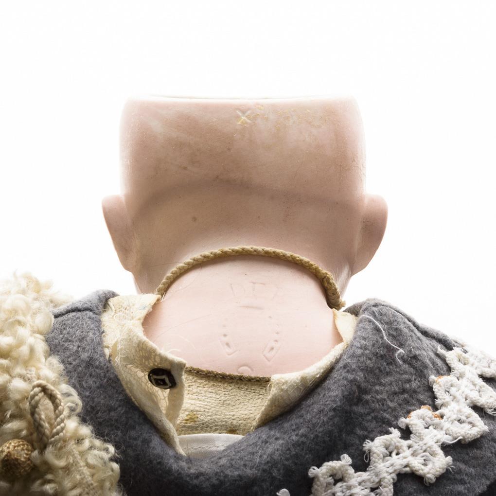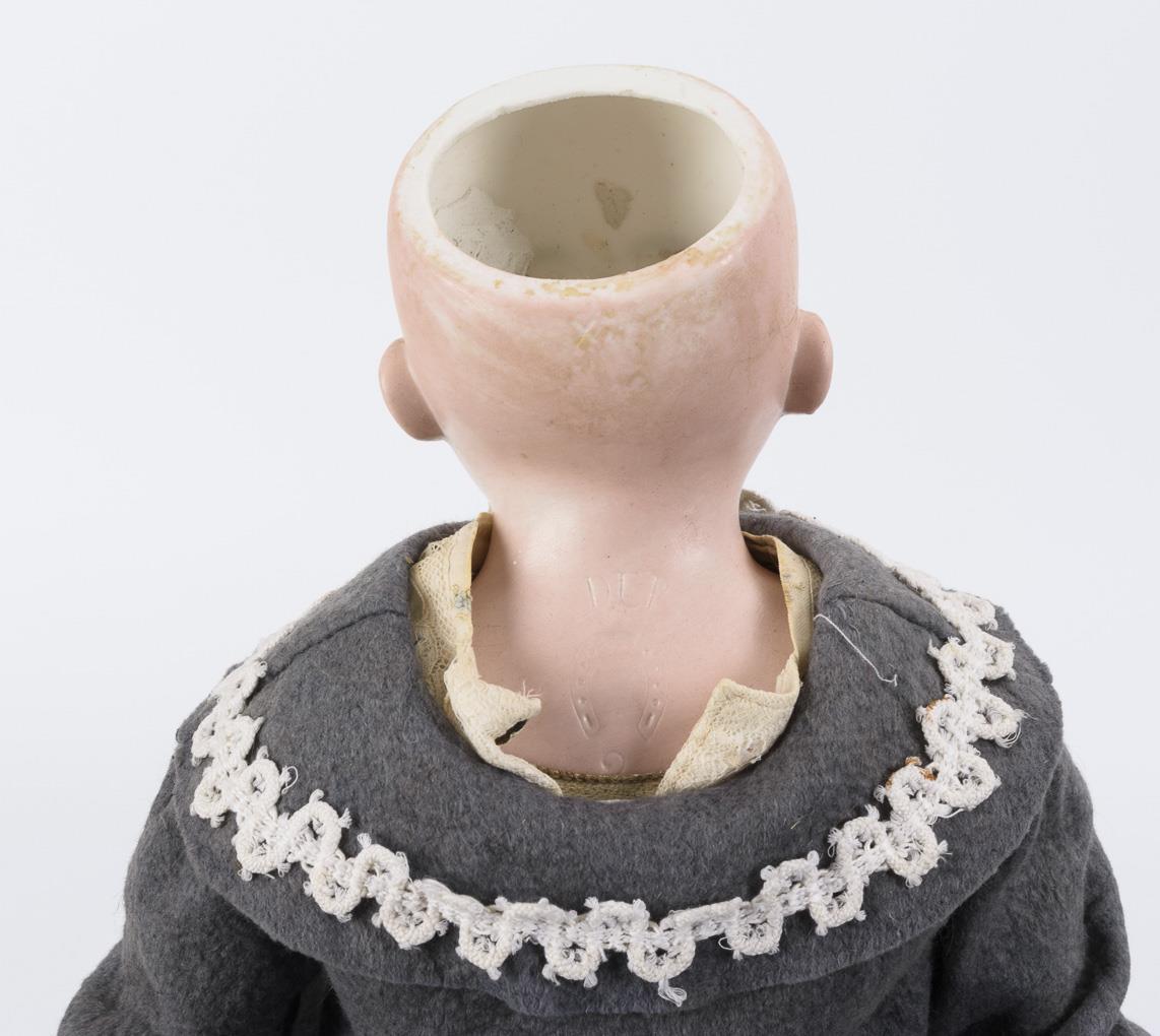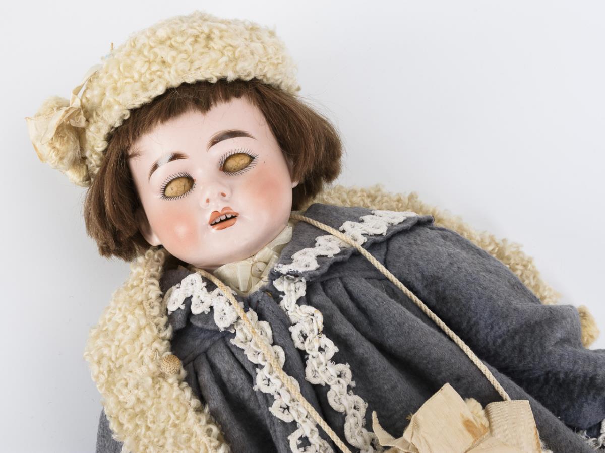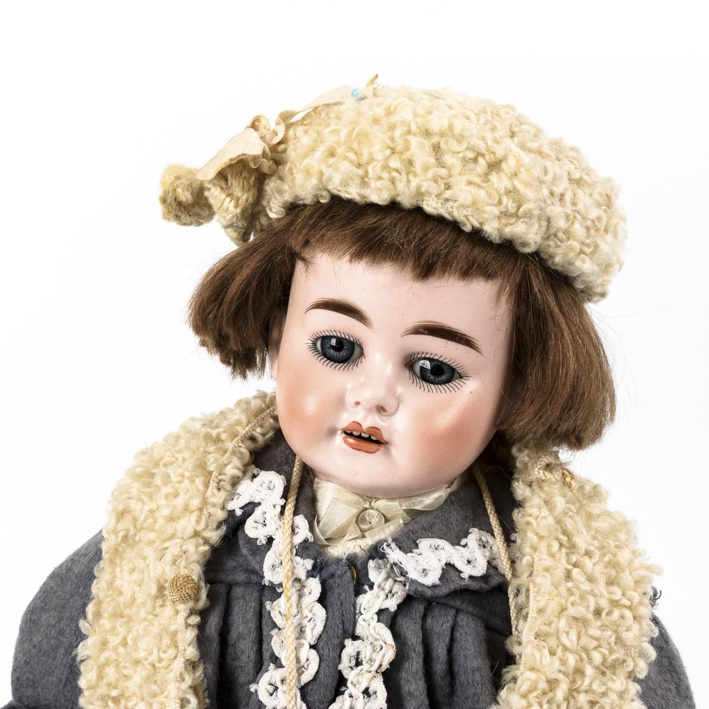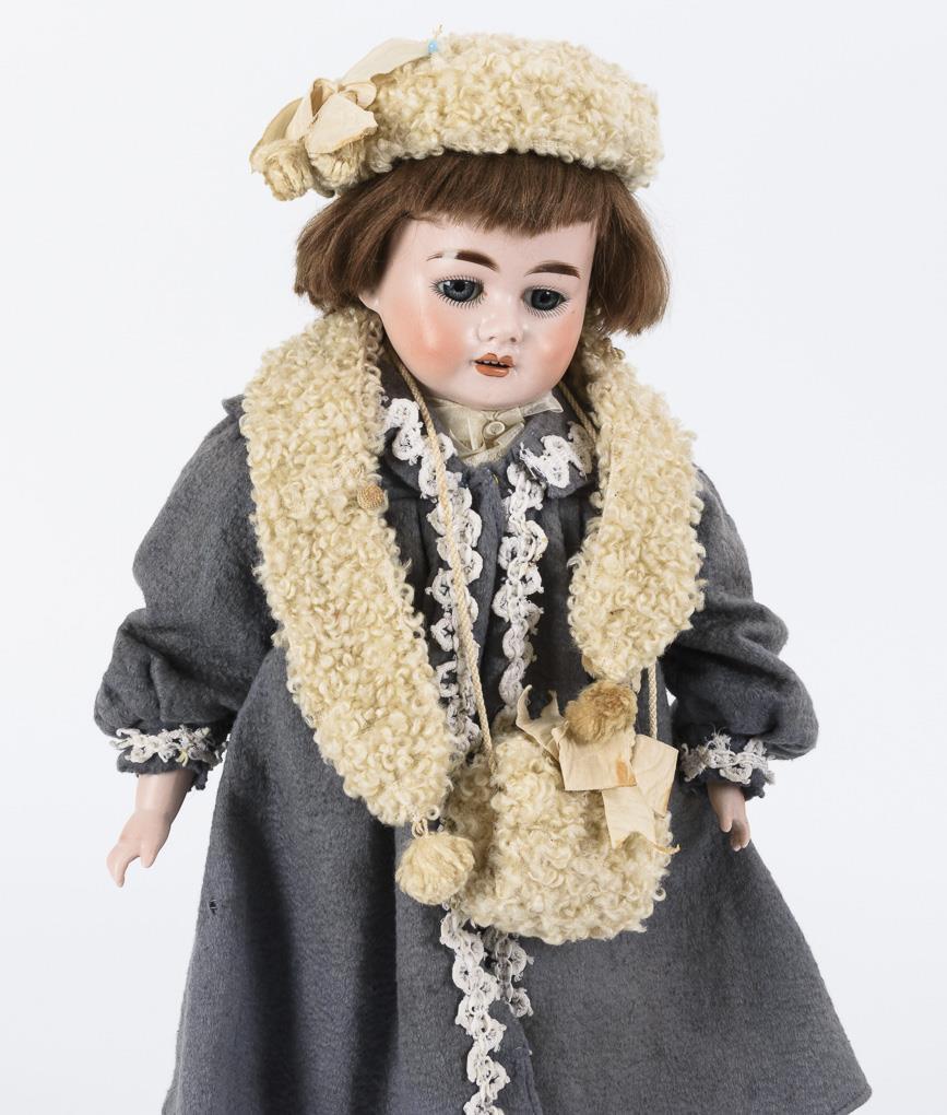 Brustkopf, blaue Schlafaugen mit Strahleniris, hellbraune Mohairperücke. Lederkörper mit Biskuit-Unterarmen, Ellbogenzwickeln und gesplinteten Beinen, Unterschenkel aus Stoff. Helles, geblümtes Voilekleid, nachgenähter, grauer Filzmantel, weiße Pelzkappe, passende Mütze und Schal. Kopf durchleuchtet: am Hinterkopf herstellungsbedingte Schattenlinie (Schichtkante im dünn gegossenen Porzellan). Unterschenkel fleckig.