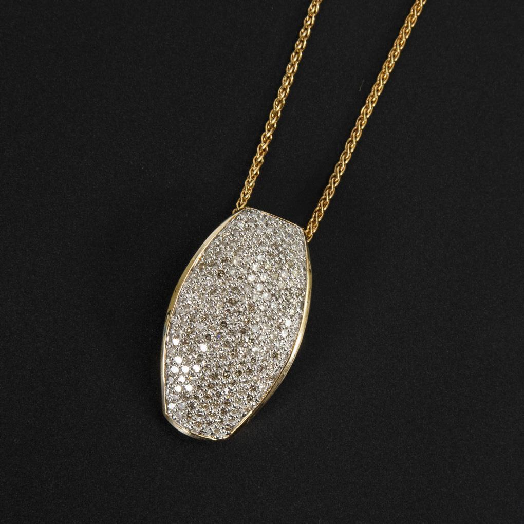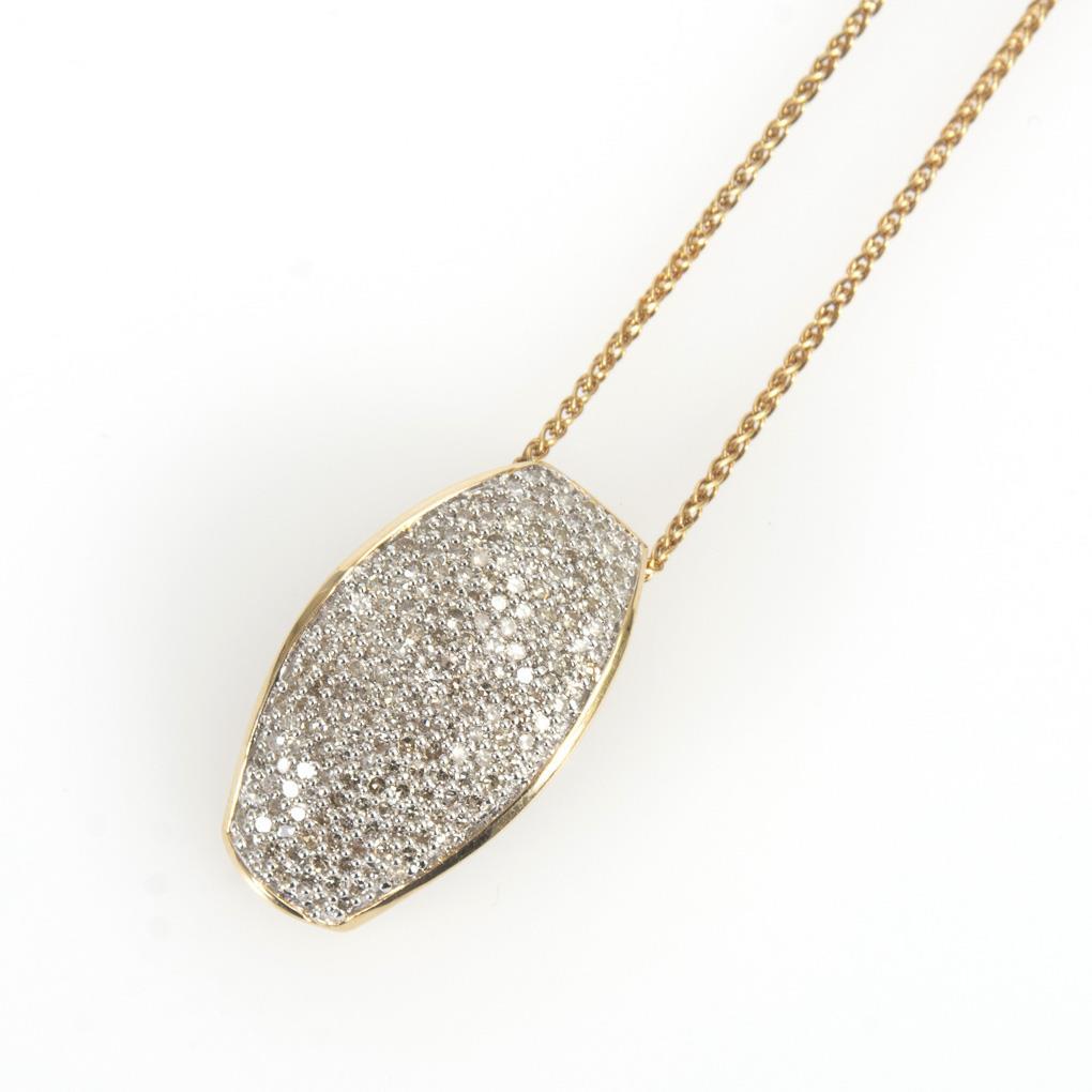 Moderner Anhänger mit diversen Diamanten in Pavéfassung. Zarte Zierkette mit Karabinerschließe.