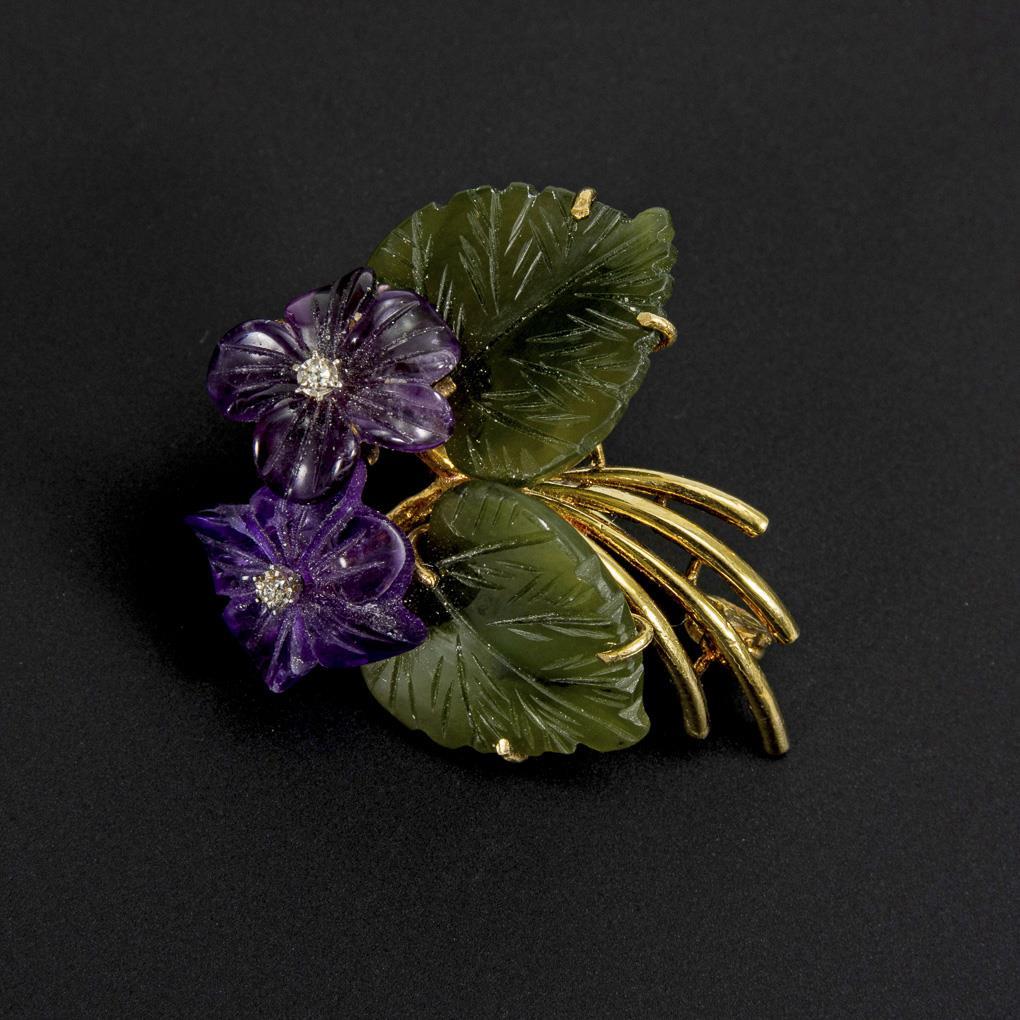 Brosche mit geschnittenen Amethystblüten, Jadeblattpaar und kleinen Diamanten. Kugelhaken.