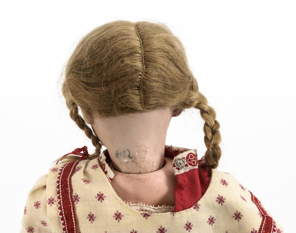 Nachgenähtes rot-weißes Kleid mit Matrosenkragen, Strohhut, schwarze Wachstuchschuhe. Perücke fest: Kopf nicht durchleuchtet, jedoch ohne sichtbare Defekte.