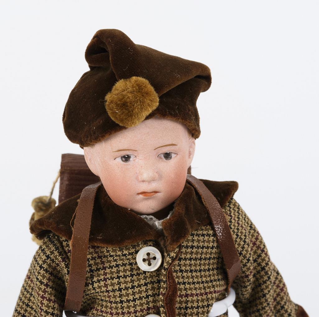 Kurbelkopf, gemalte braune Augen, modellierte Haare. 5-teiliger Stehpuppenkörper. Karierter Anzug, braune Samtmütze, braune Schultasche. Rechter Arm repariert.